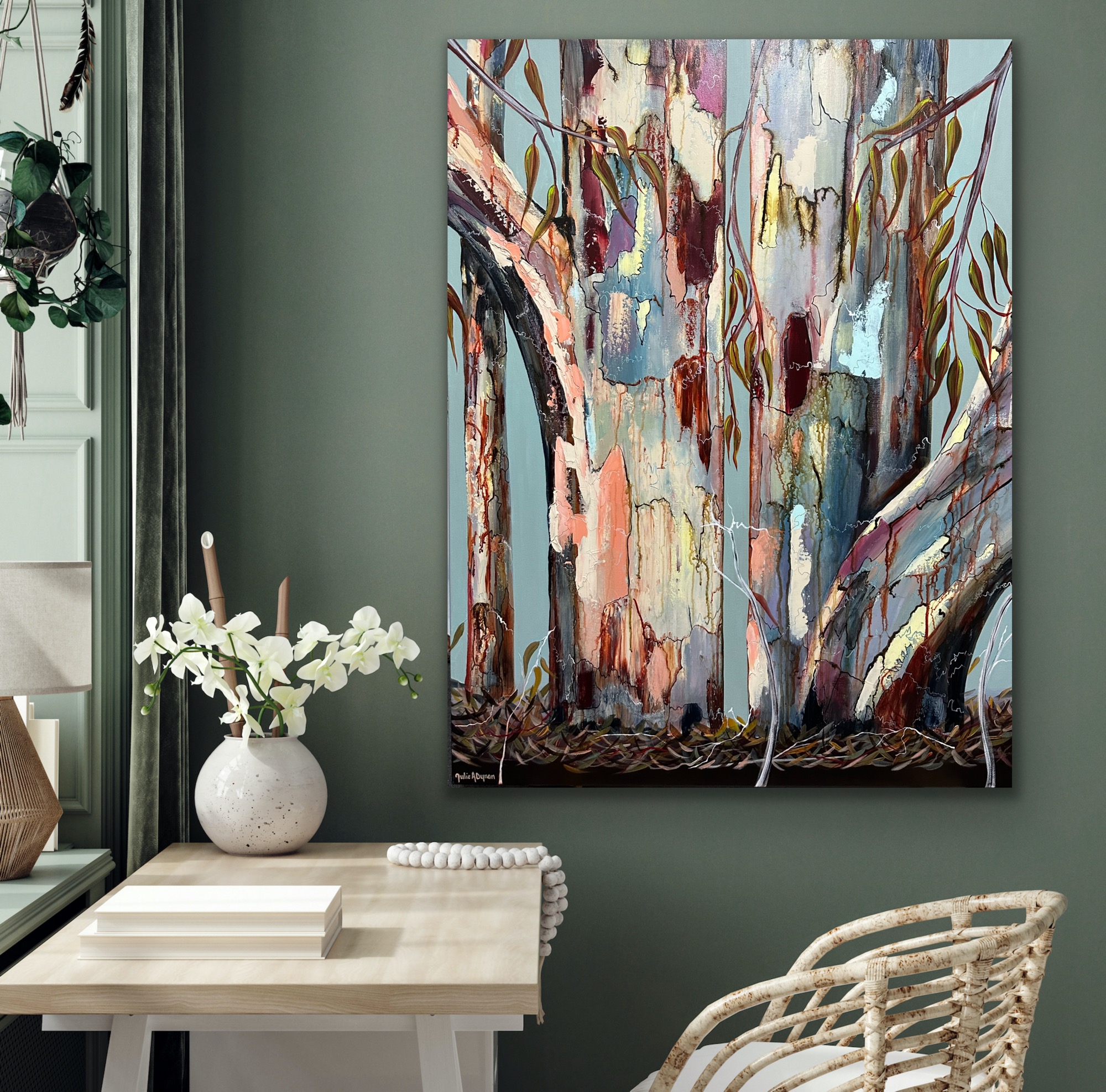 ’Strong and Unyielding- Colourful Tree Series’ by Julie Dynan an original acrylic artwork which has colourful bark with lots of detail, gum leaves on branches with dried leaves and twigs on the forest floor.