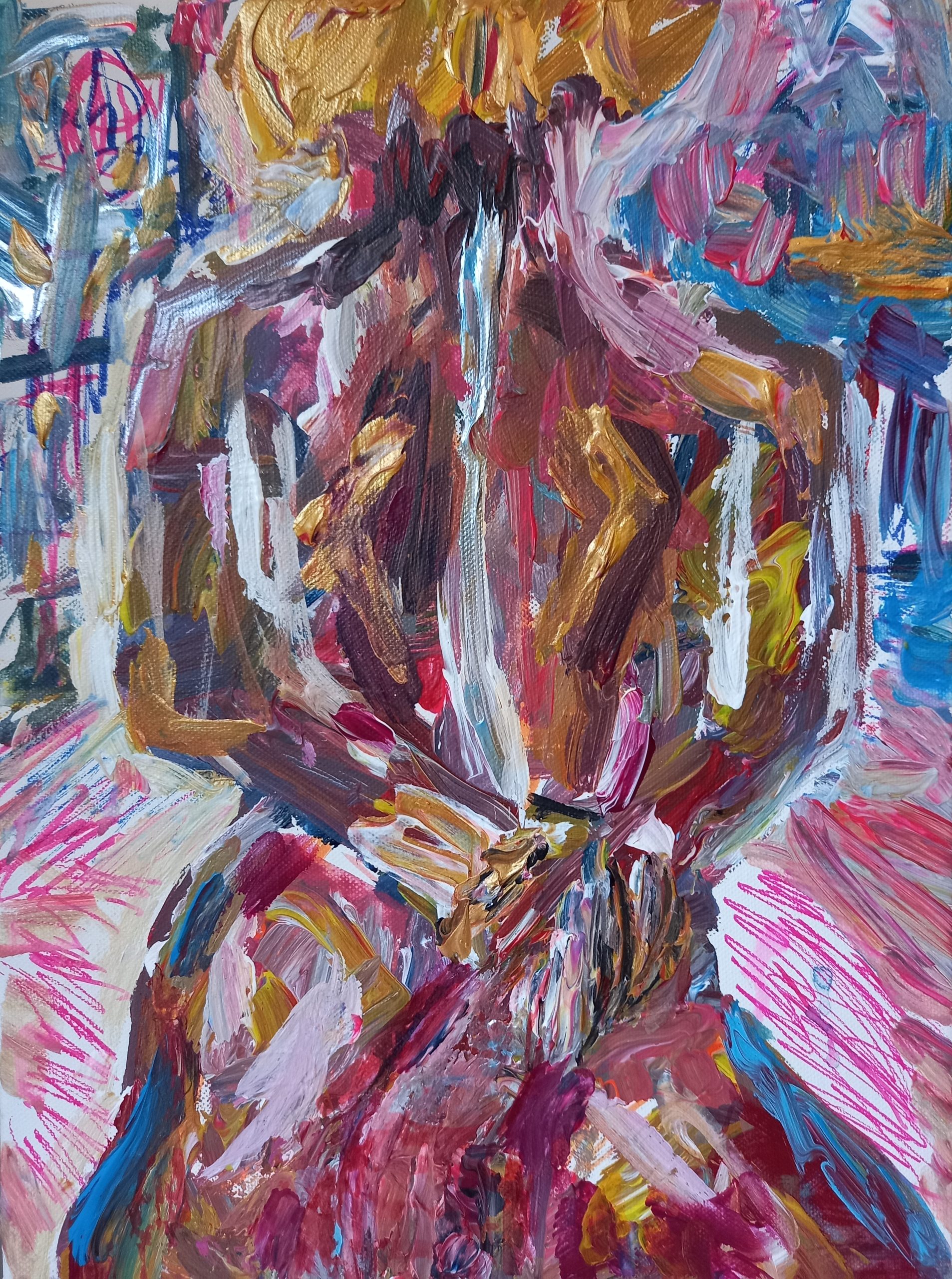 Vibrant interaction of paint and felt tip pen. A strong standing figure facing the world. Beautiful vibrant piece.