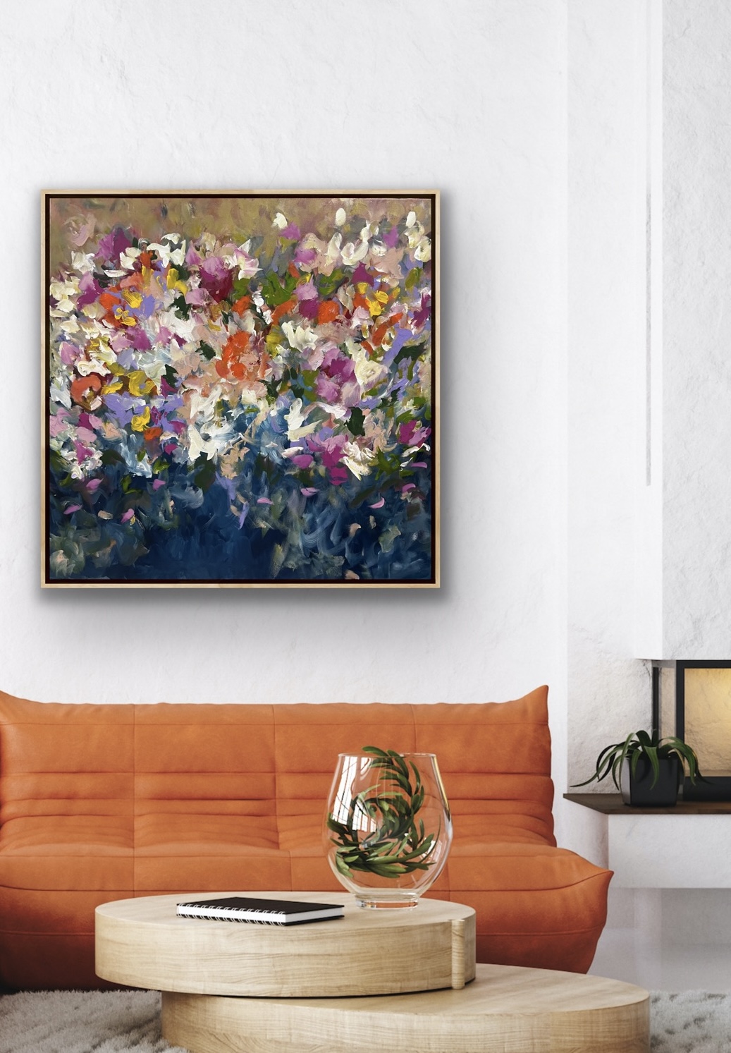 My abstract artworks especially with floral impressions from memory complete my creative journey, making it soulful and I believe that fulfilling experience can be felt in my works freely. I love painting with vibrant colors, using hands and loose strokes of brushes, palette knives and unusual tools of craft in the process of layer building. These play an amazing role in enhancing the depth of composition.