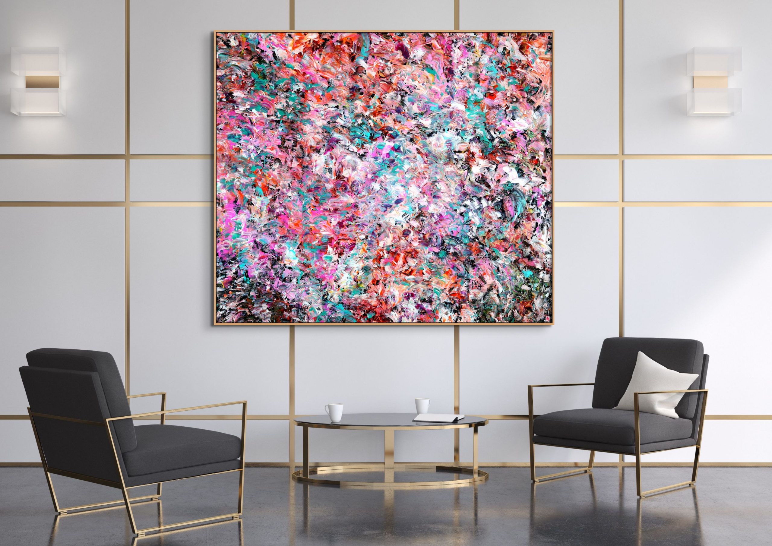 This artwork is painted on professional-grade canvas stretched and sealed with varnish. The canvas is 157cm in width by 136 cm in height. The sides are painted in the same colours as the surface, so it does not need a frame, but framing options are available. The image shown has a floating frame, purely for illustration purposes.
