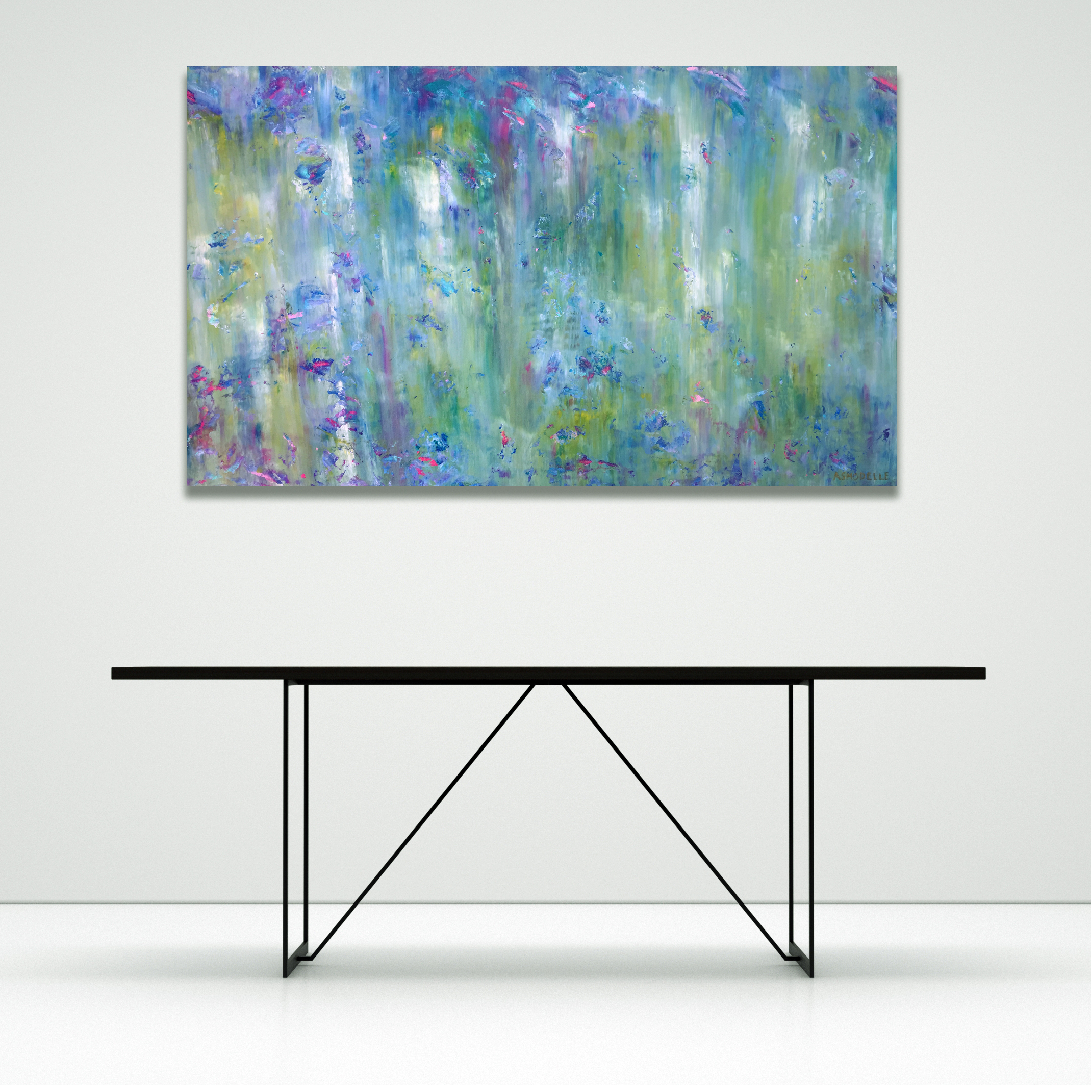 This work explores the feelings and emotions associated with the Australian bush near water when it’s subtle with blue and green and looks like a canvas itself. Painted in the style of abstract expressionism with impasto layers.
