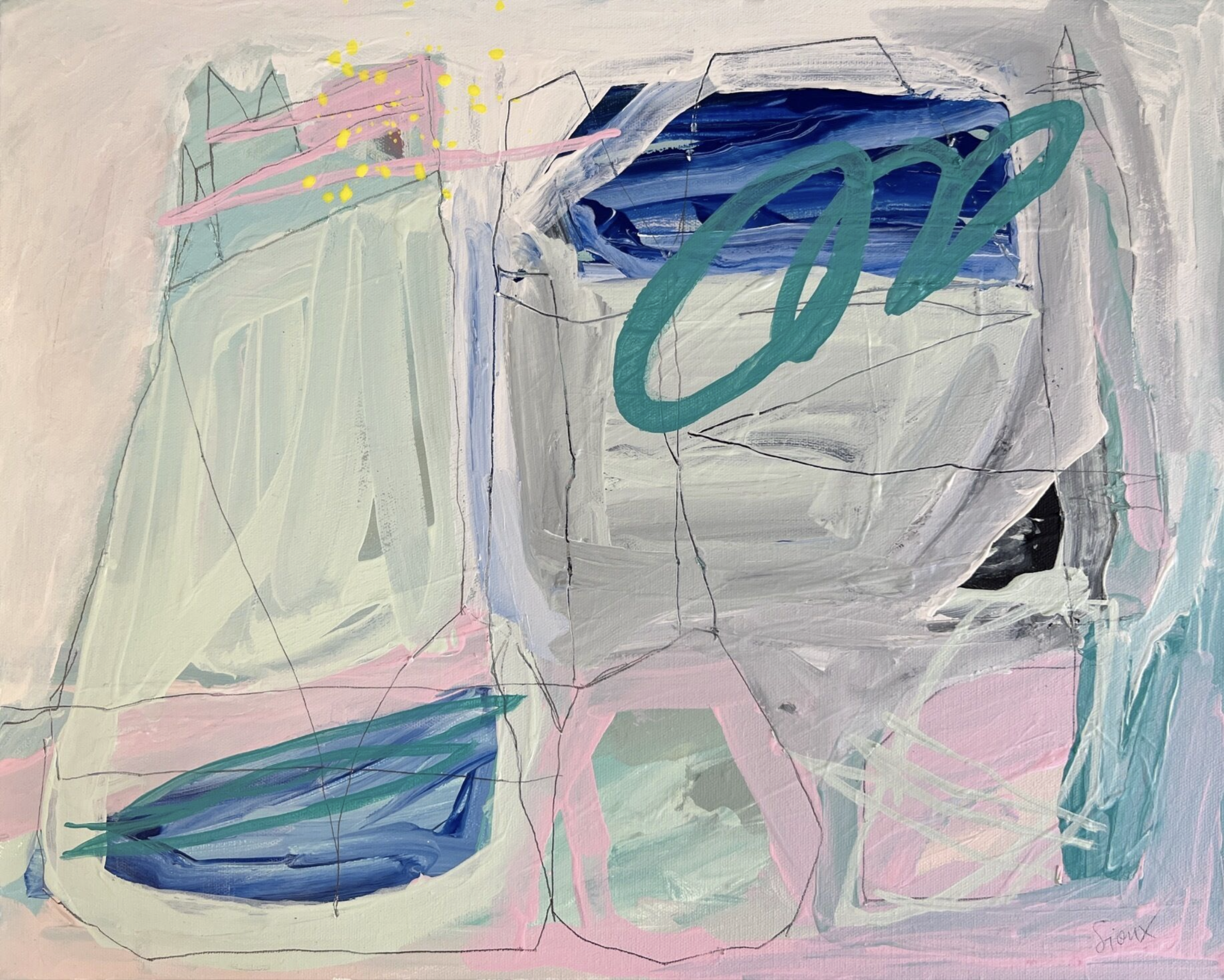 Influenced in part by the ocean, which never ceases to inspire and delight. This is one of a few small paintings I’ve been working on in the studio in between big public art projects. Changing in scale from painting a 50m long mural on the road to this small canvas was a challenge. Instead of painting with a 270mm roller and using my whole body, I used tiny paint brushes, each stroke being quite deliberate. So while it is an abstraction, there are many considerations such as palette, form, scale, composition, line etc. Enjoy!