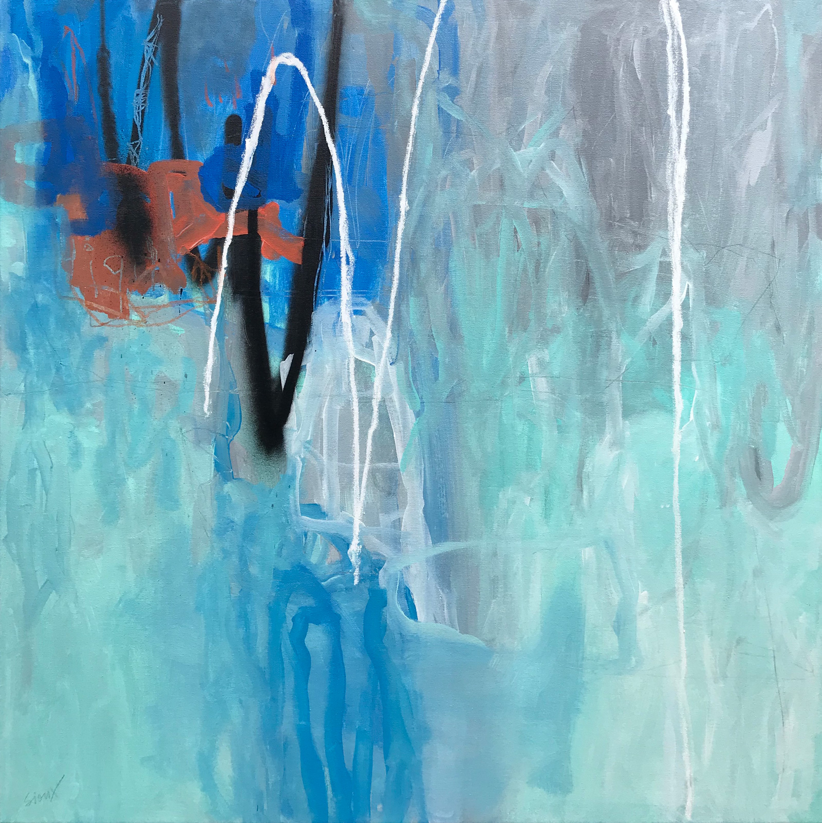 Ocean blues and a dash of sunny orange feature in this multi-layered original abstract painting. Between the layers are hidden words, emotive marks and evident brush strokes. All which show the vibrancy and energy which went into creating this artwork. I’m an inner-city Perth dweller and lover of street art. So it’s hard for me to resist having a spray with aerosol. The edgy black spray creates the focal point. My signature white ‘energy line’ over the top binds the layers together and creates an eye-catching, visually balanced painting.