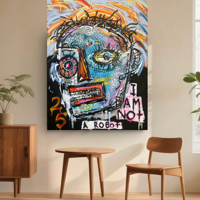 I live for painting, it’s my passion. I listen to loud music in my studio and this often inspires the marks, the words and the energy. Through this painting I transfer my energy on for you to soak up in any room you desire. A splash of brilliant blues to add vibrancy to your days. Enjoy!