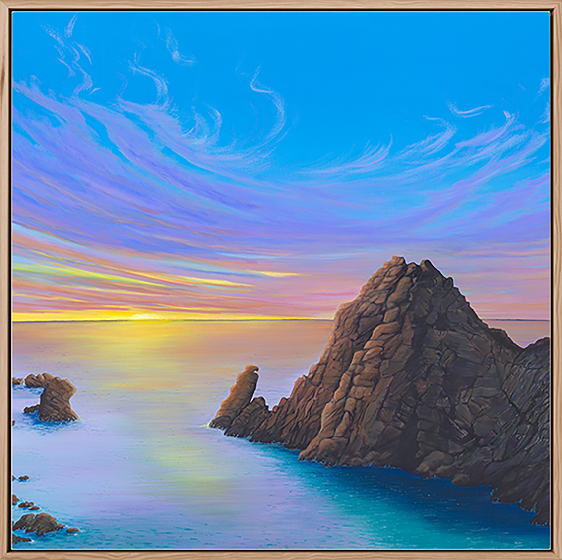 “Sugarloaf Rock at Twilight” captures the iconic rock formation as day fades into night. The sky is painted with soft twilight colors, with shades of pink, purple, and blue reflecting on the water. The rugged shape of Sugarloaf Rock stands strong against the horizon, surrounded by the calm sea. This painting shows a familiar landmark in a quiet, magical moment of transition from day to night.