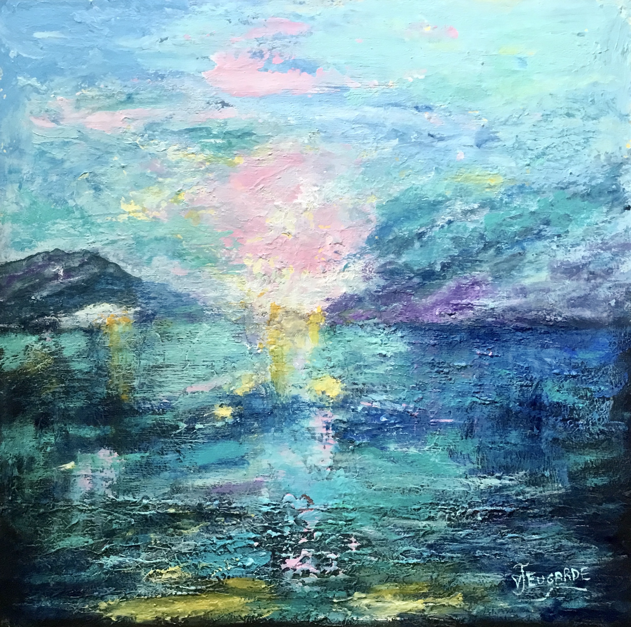 Summer Bay by Valerie Eugarde – This is one of my abstracted Seascapes using my favourite colours over a very textured surface, summer is all about feeling relaxed and sun kissed and having that therapeutic sand massage on your feet without paying a cent. I think if everyone could walk the beach daily they would feel less stressed so having this on your wall is designed to chill the mind and take you to a place in the sun without leaving home.