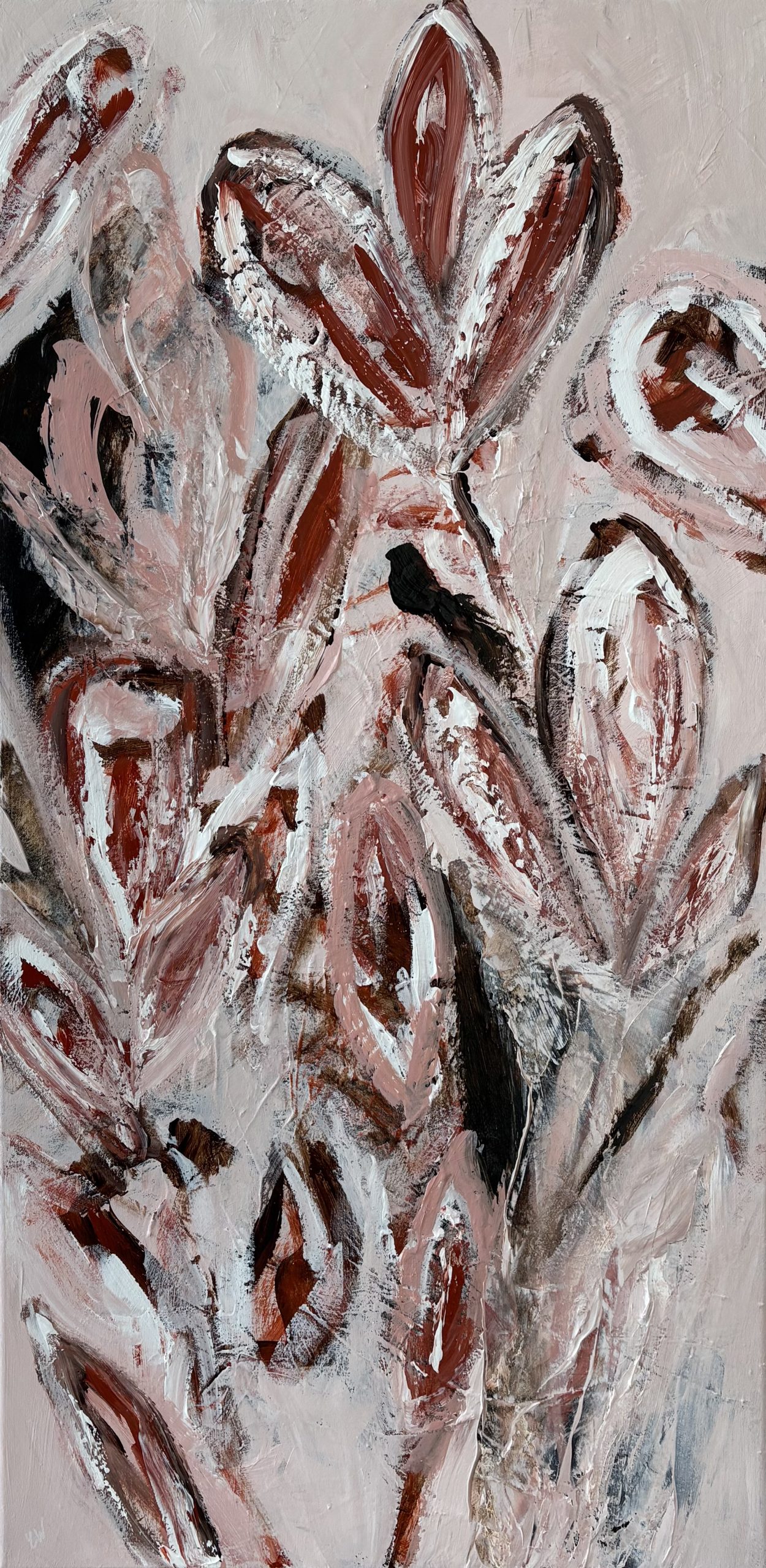 Summer Bloom by Carrie Welsh is a beautifully textured abstract botanical painting. 101.6 x 50.8 cm. Acrylic on canvas, ready to hang. Frame not included.