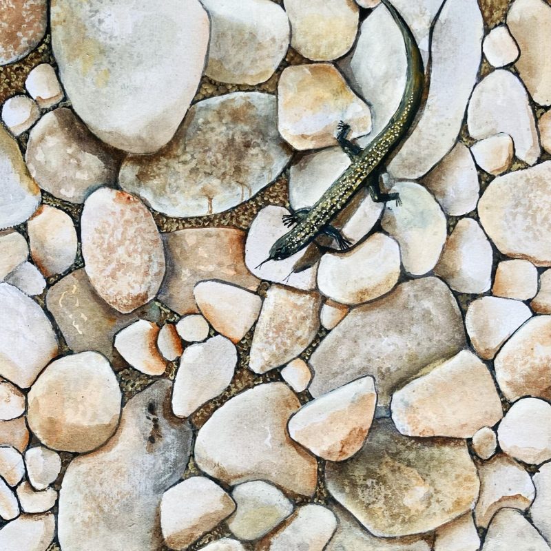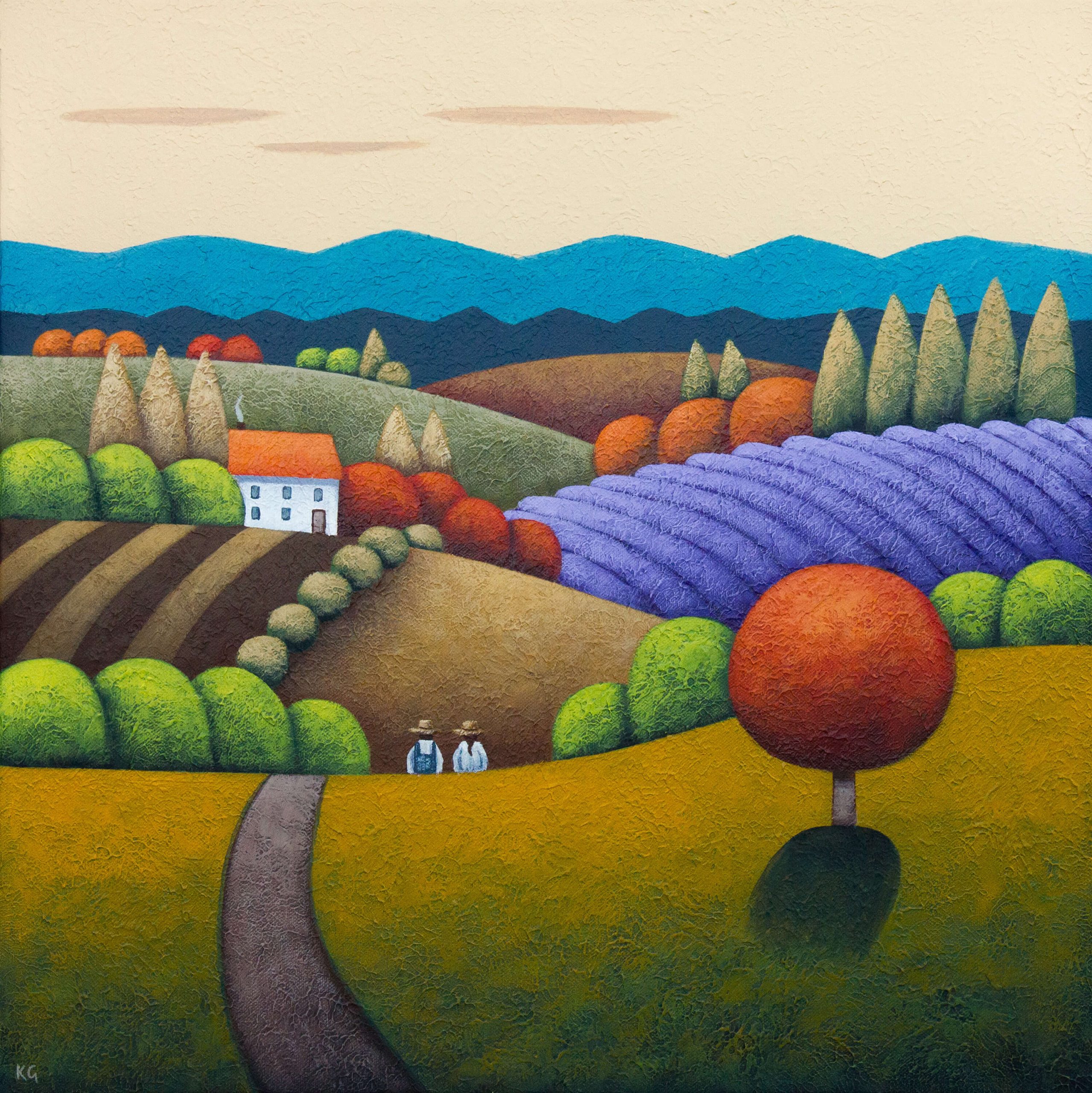 This square canvas features rolling fields of lavender and lush green grass, trees and a single country house with two farmers walking along the path. Mountains in the background underneath a yellow sky. With an under-painting of texture, this piece is given dry-brush charm with an abundance of texture throughout the canvas. The vivid colour scheme is warm and cheerful, being a striking piece to add to any collection. This style provokes the ideas and expectations of the colours around us and seeks to explore how those colours have an effect on the viewer. Painted on quality canvas, hooks and wire on back so ready to hang, but can also rest on a shelf. Sides painted in continuance of composition.