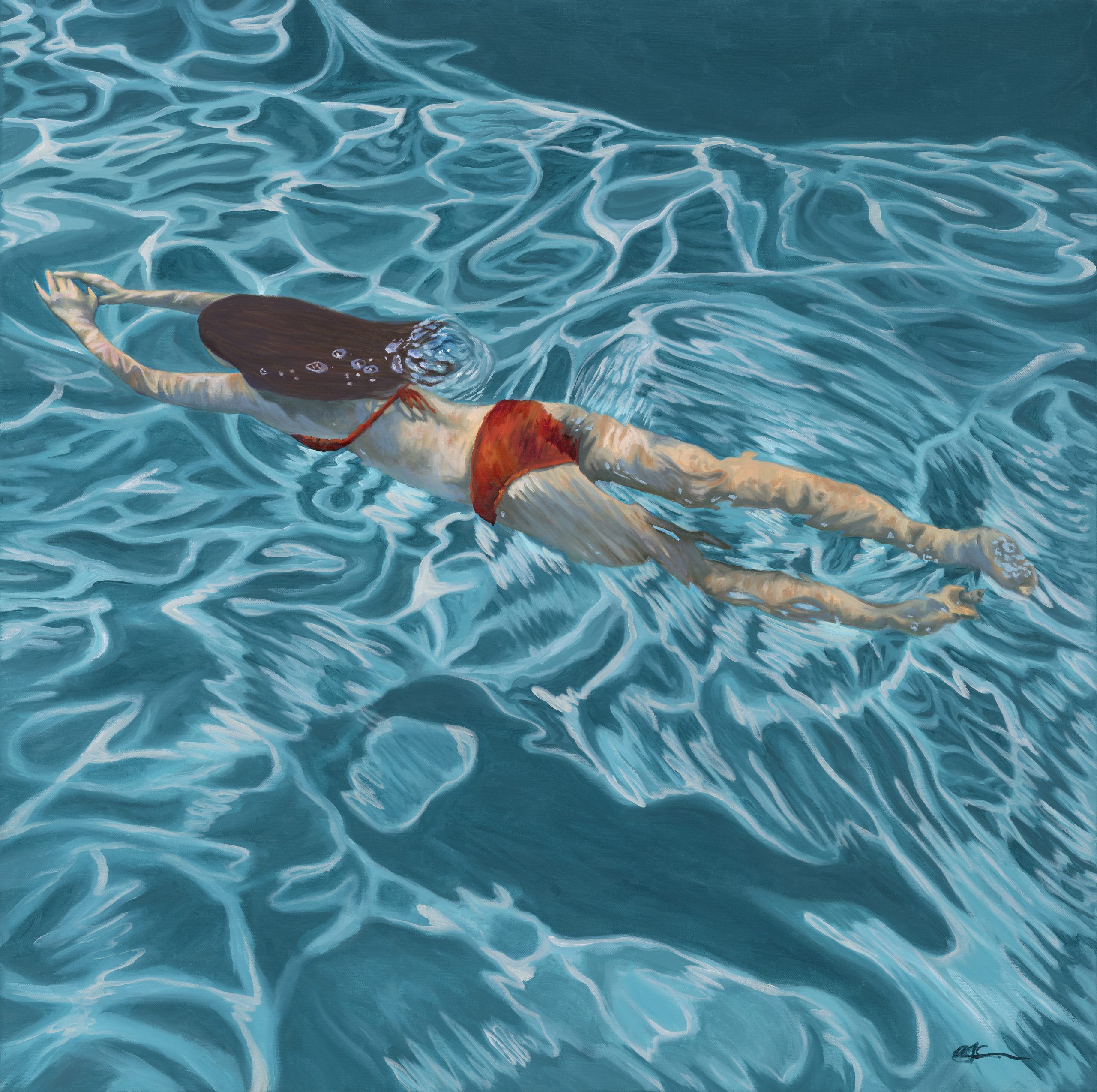 This piece is one of my ‘Swimmer Series’ of paintings. It is an investigation into the interaction and connection between light, water and form. Amanda’s work is focused on the quest for finding refuge, quietness and escapism. Some [paintings] focus on the lone swimmer.The few minutes of introspection when submerged in the warm quiet of water. Others investigate the interaction of people within various aspects of the landscape.