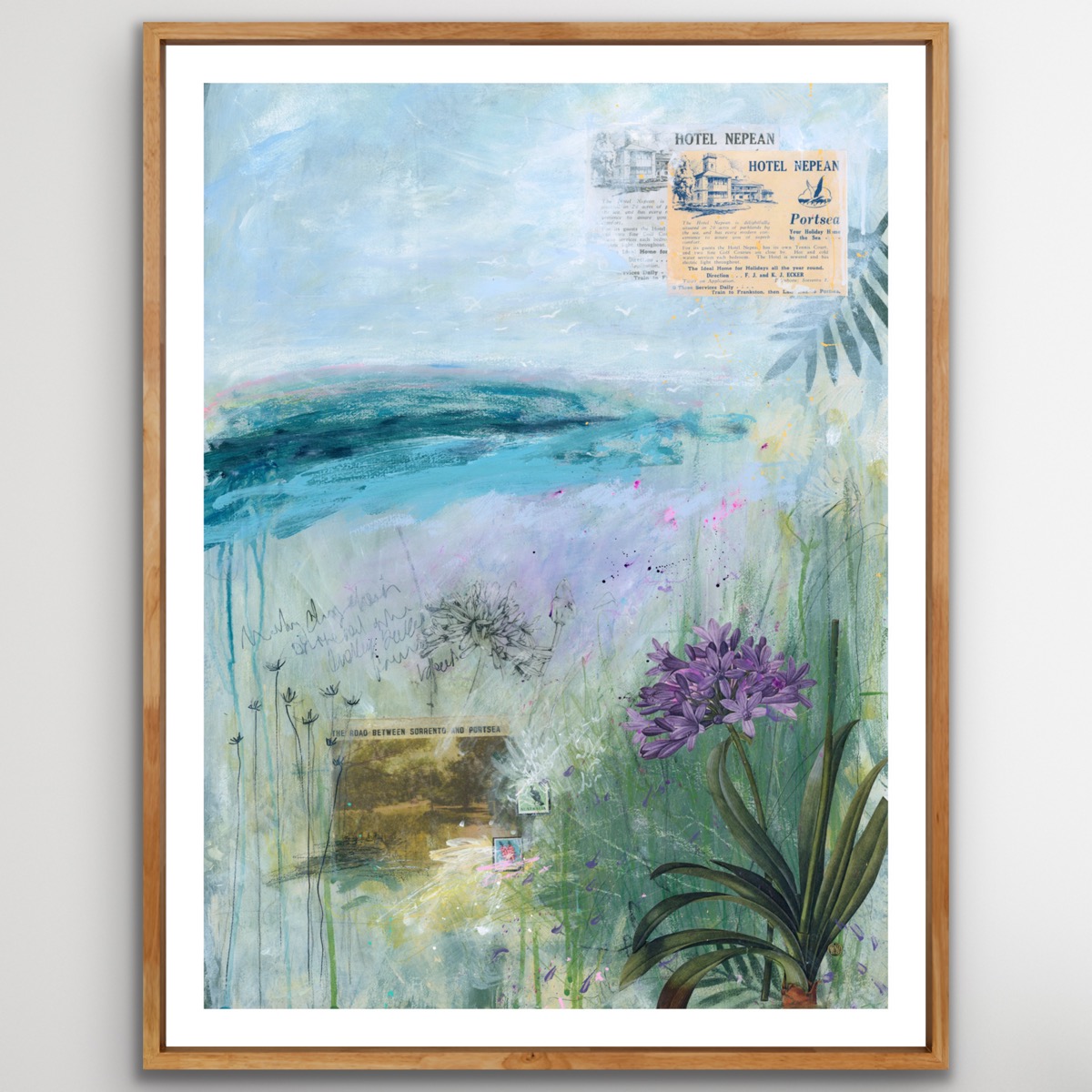 This painting reminds us of warm summer evening nights amongst Shasta daisies, Agapanthus & wild seaside grasses.. Walking along dusty dirt tracks with after dinner childhood treats & sending off a post cards to a friends. Perfect beach house or coastal living art. Beach colours & vintage collage.