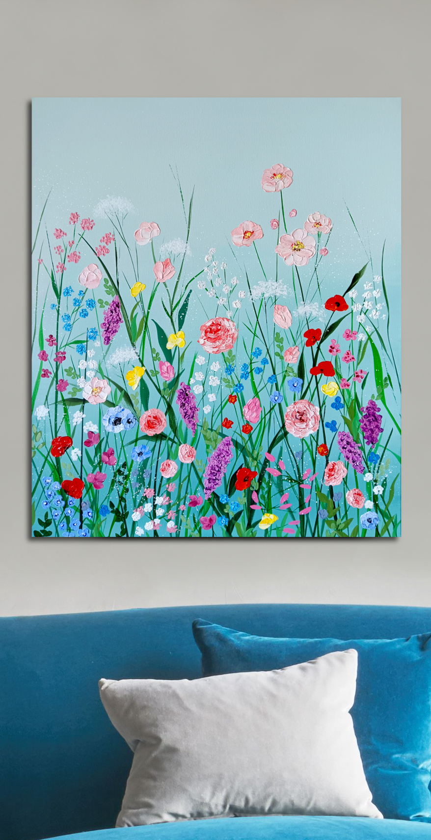 Summer Flowers – Textured Flowers Painting by Eva Pearl – Acrylic on canvas, stretched and ready to hang. There is a lot of texture in this painting. This impasto painting was created using a combination of brush strokes and palette knife techniques. It has layers upon layers of textured high quality acrylic paint.