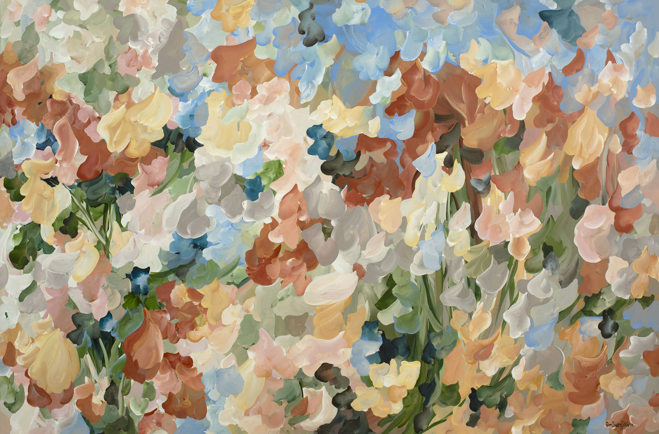 Summer Garden by Amber Gittins – 150x100cm Extra large floral abstract in browns, apricot, orange, greens and yellows