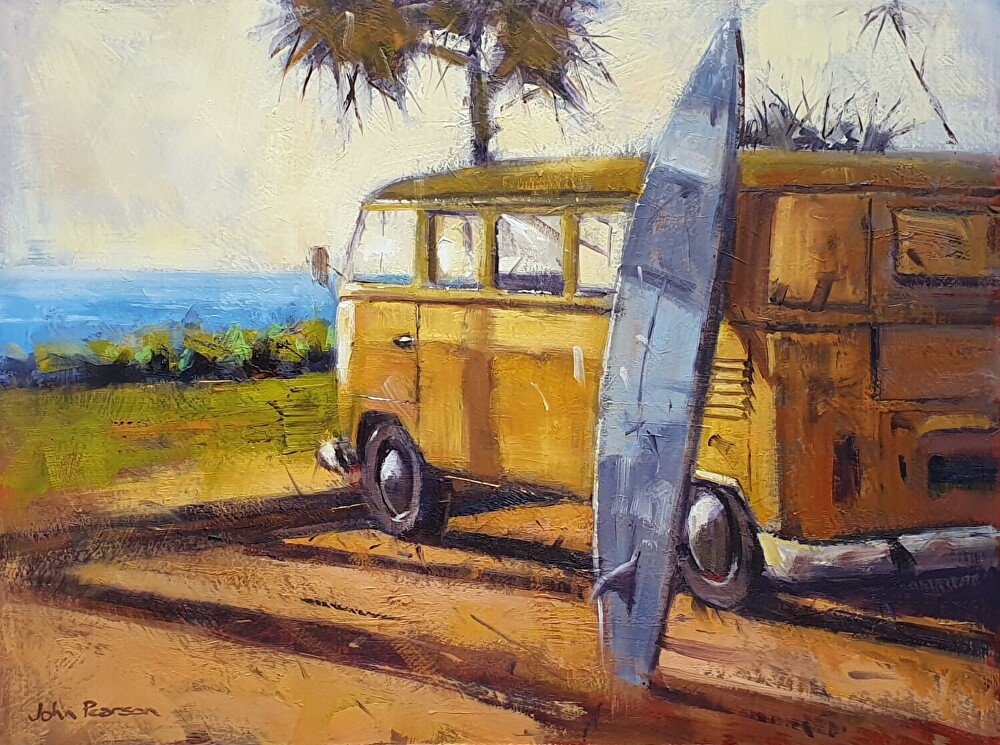 It’s a perfect summer’s day and the early sun lights up a Kombi van parked next to the beach with a surfboard near the rear.