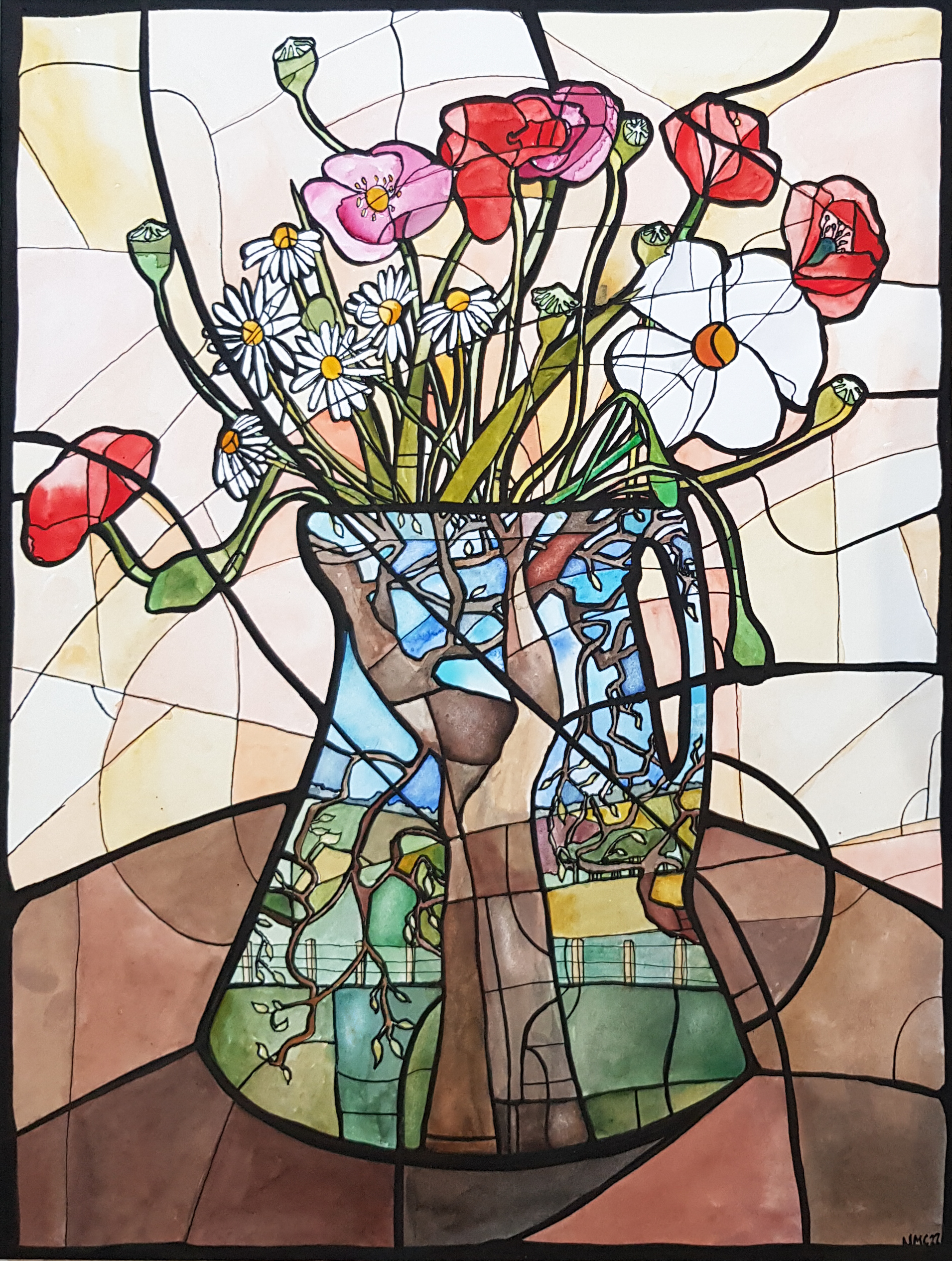 Painted during a trip home this still life depicts a jug decorated with a Scottish landscape holding a bouquet of beautiful poppies and daisies.