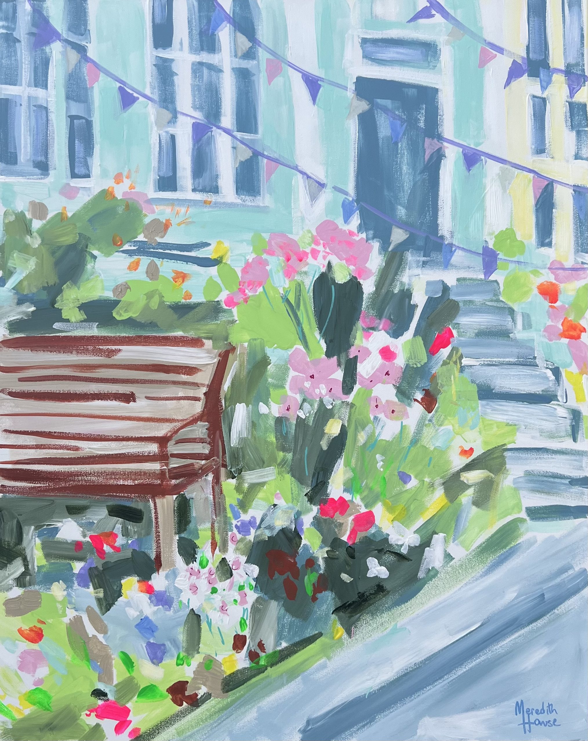 Summer in Wales by Meredith Howse is a beautiful light-filled, semi-abstract painting capturing the vibrant essence of a flourishing coastal garden next to a Victorian home in Llandudno, Wales. Using negative space to evoke light and movement, the artwork features a palette of fresh greens, pastel pinks, and bright colourful highlights.