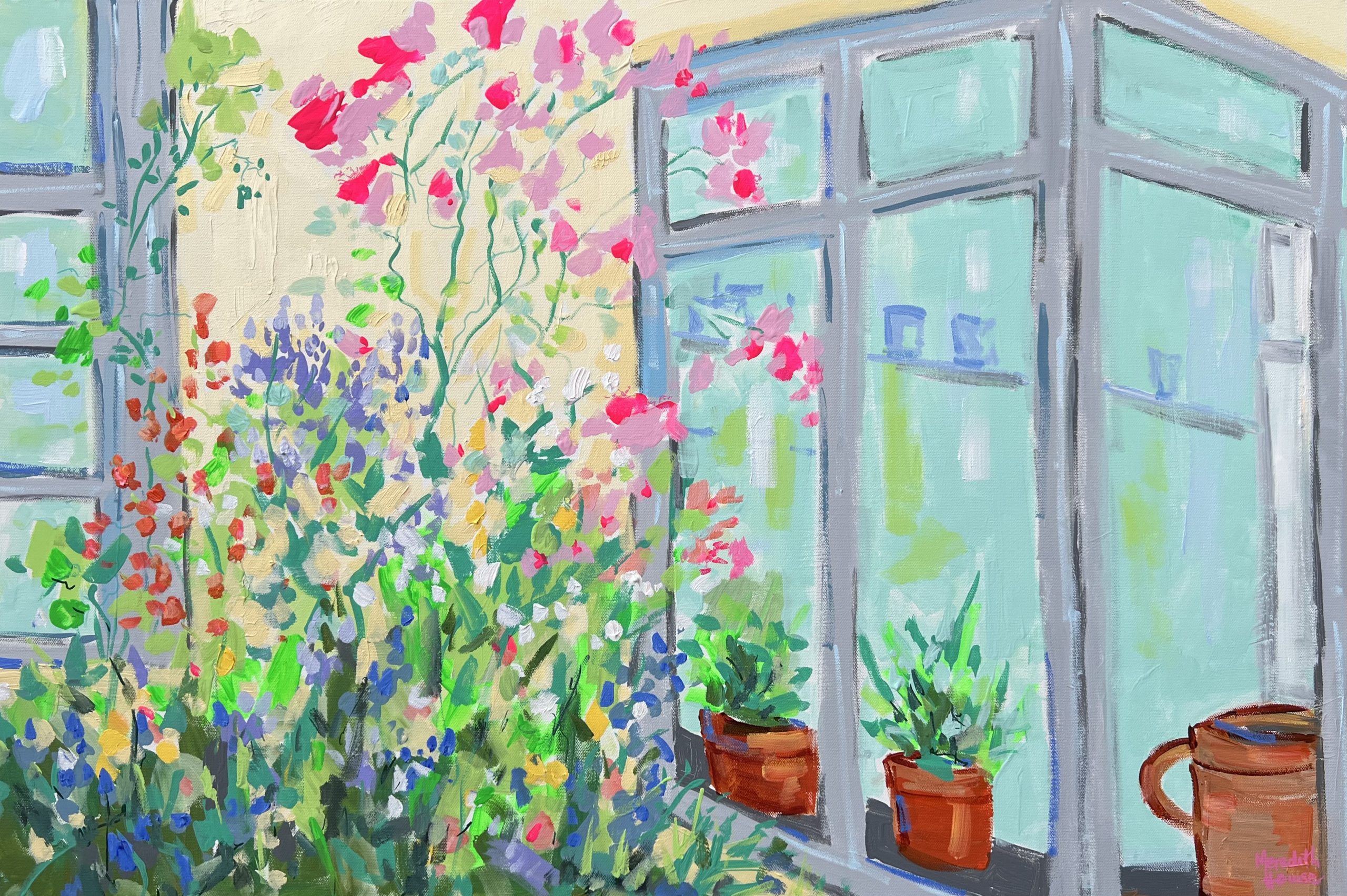 Summer in Willowvale, Nairn by Meredith Howse is a beautiful light-filled, fresh semi-abstract painting capturing the vibrancy of a flourishing home garden in Nairn on the Scottish coast, near Inverness. Using negative space to evoke light and movement, the artwork features a palette of fresh greens, pastel pinks, and bright colour highlights.