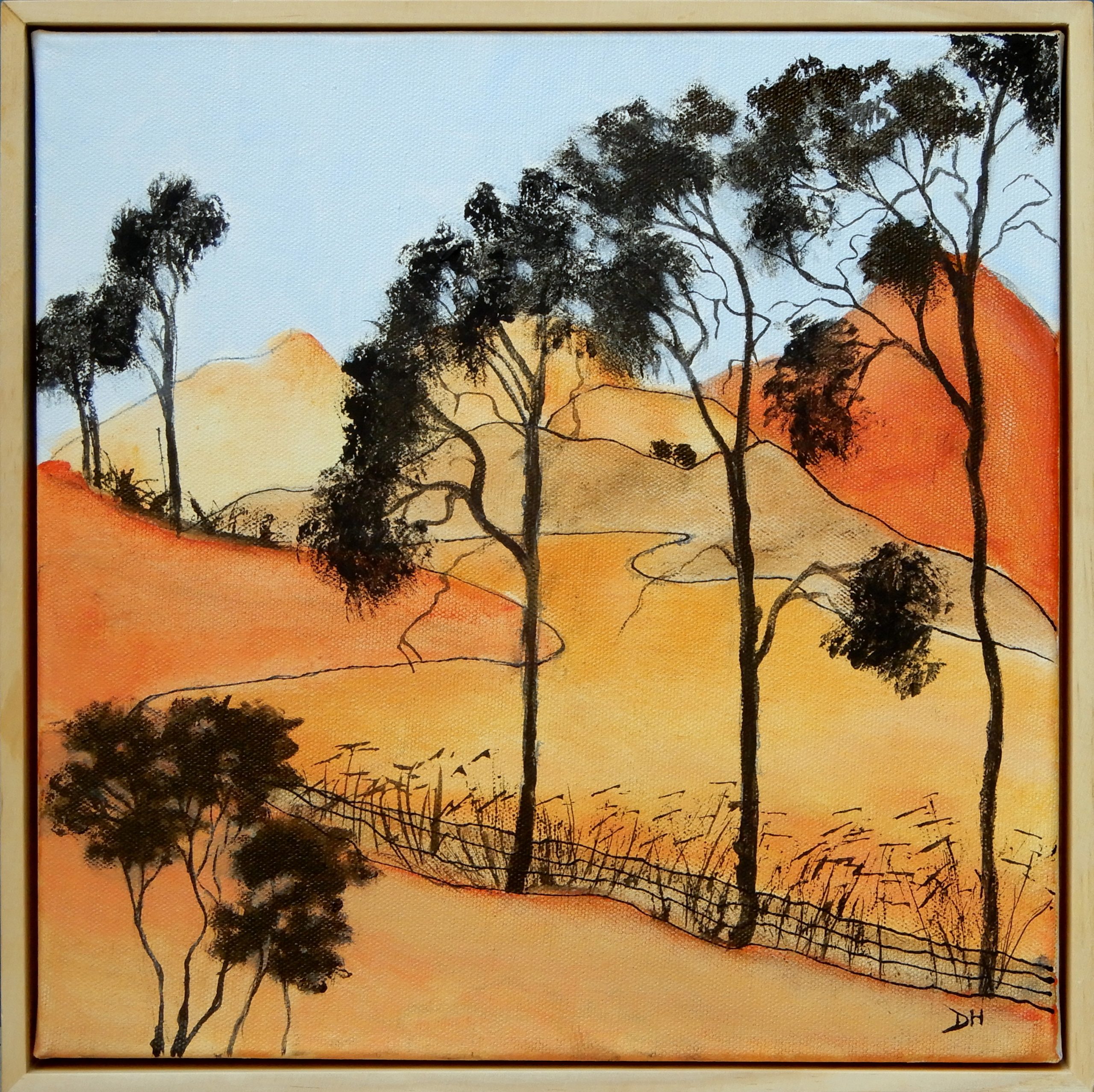 Summer light over the Red Centre, when the gums look black and the earth glows orange and gold. This painting comes ready to hang in a natural oak frame.