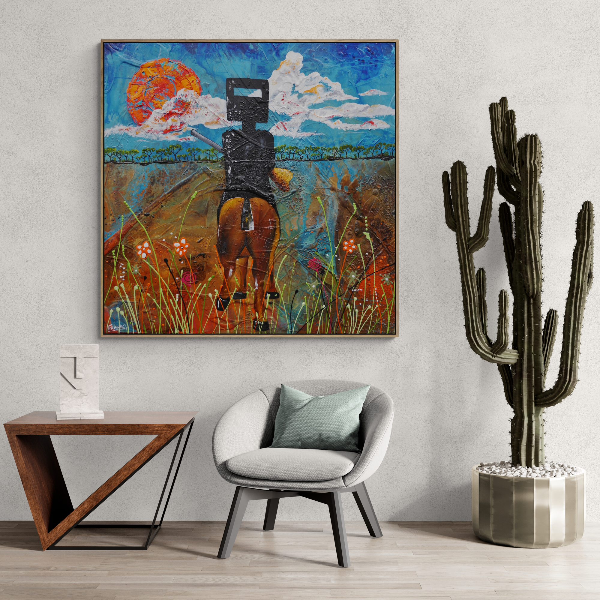 Provided with listings are some insitu images. We strive to ensure they are accurate in scale. Sometimes we will add an external frame to the painting insitu, to provide a vibe for how that would look also. As mentioned above, my pieces arrive ready to install with gallery finished edges and honestly, most people don’t add external framing. However, it is of course an option. If you have any questions, please let me know. We are here to help and want to make it as easy as possible for you if your décor aspirations require it.