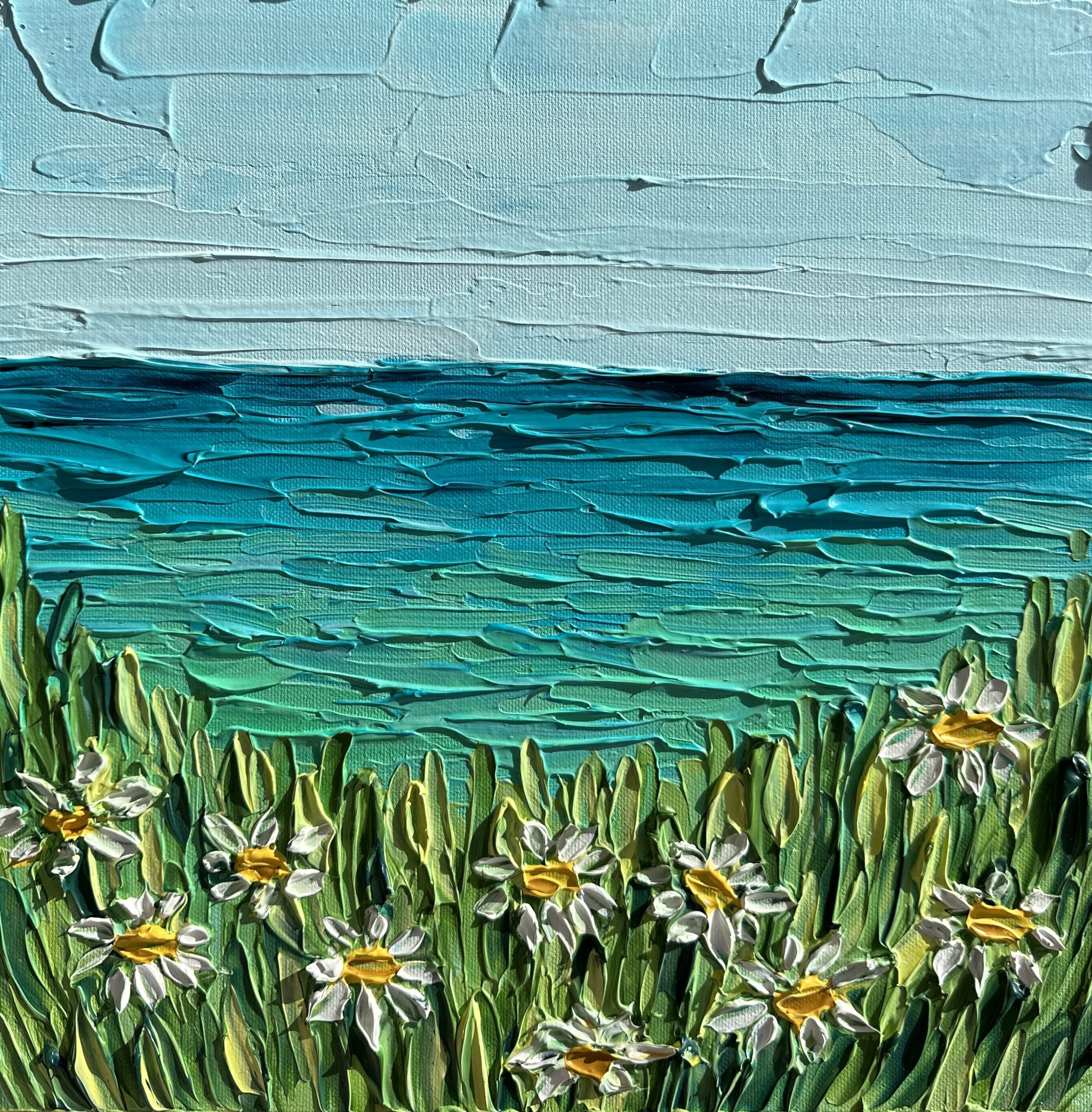 This tranquil artwork transports you to a serene coastal paradise. The ocean’s clear turquoise waters stretch to the horizon, their surface so calm that it mirrors the sky’s soft blue hues. In the foreground, a bed of daisies graces the shore, their pure white petals dancing in harmony with the gentle sea breeze. This scene is a perfect embodiment of natural serenity, where the serene ocean meets the delicate beauty of wildflowers, creating a sense of peace and connection with nature.
