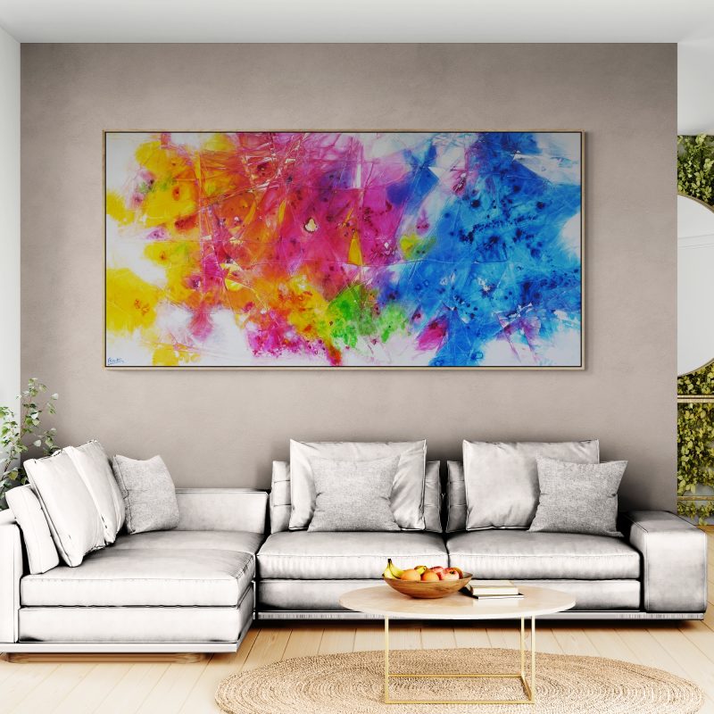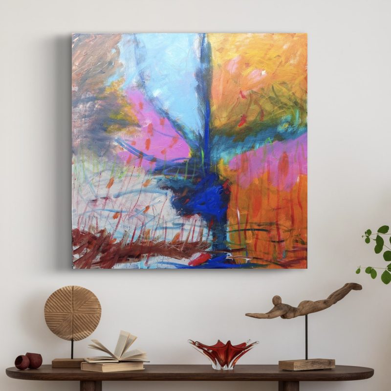 This piece is super cute with its playful orange pink and yellow background finished of neatly with a pink frame