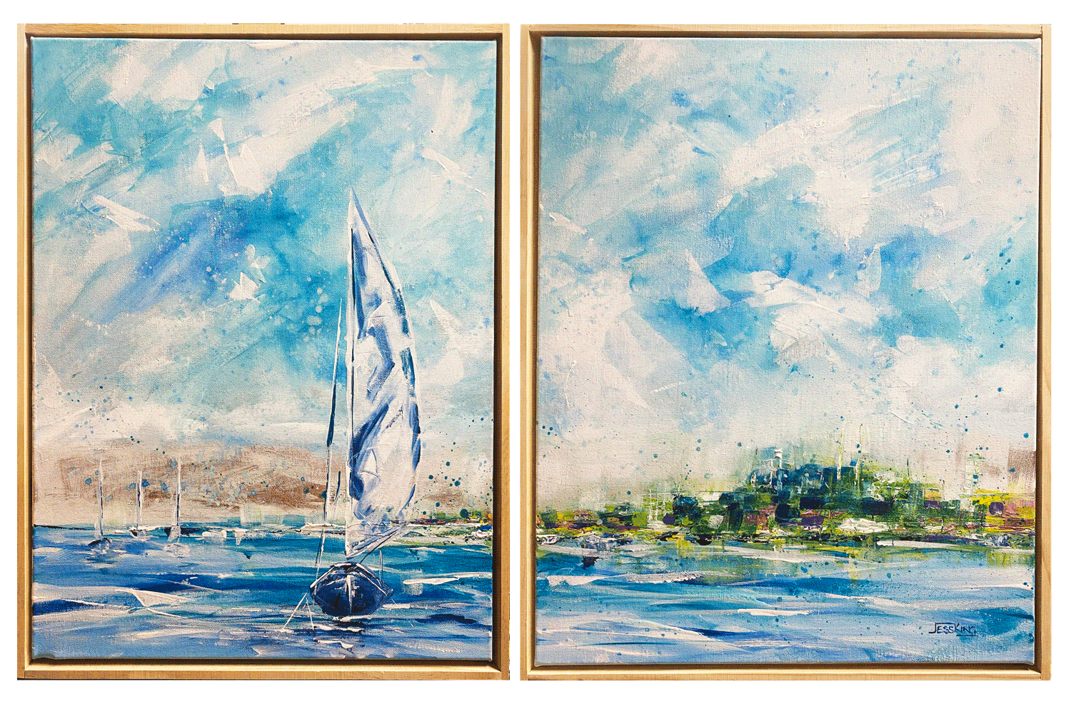 Summer Sailing – Dyptich. Original artwork by Jess King Artist. Acrylic on canvas, silver foil, framed and ready to hang. Sailing, enjoying summer and the sea breeze, no better place to be than on the cool blue water, wind in your sails and destination … well wherever you want to be.