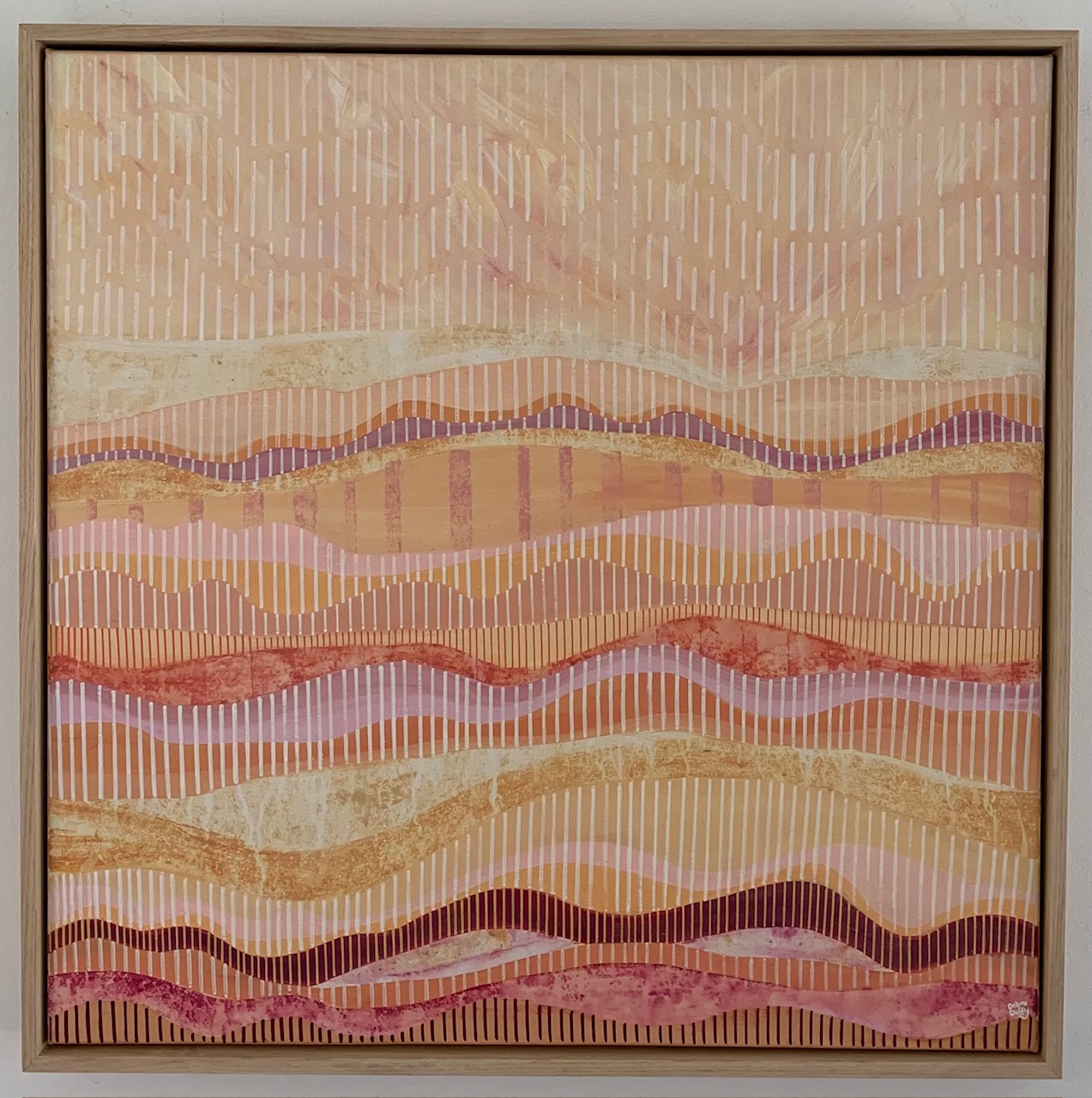 This artwork is an original abstract using acrylic paint and artist markers. My inspiration was to create an atmospheric abstract landscape with lots of detailed areas throughout using contrasting textures accentuated with stripe patterns weaved throughout.  My focus was to use a limited colour palette with a graduation of hues of orange, burgundy, pink ,tan and white. This combination creates a warm and summery glow while the echoes of the captivating sky with repetitive patterns dance in sync throughout this imagined landscape. ‘Summer Scent’ is reminiscent of summer days and sunsets aglow.