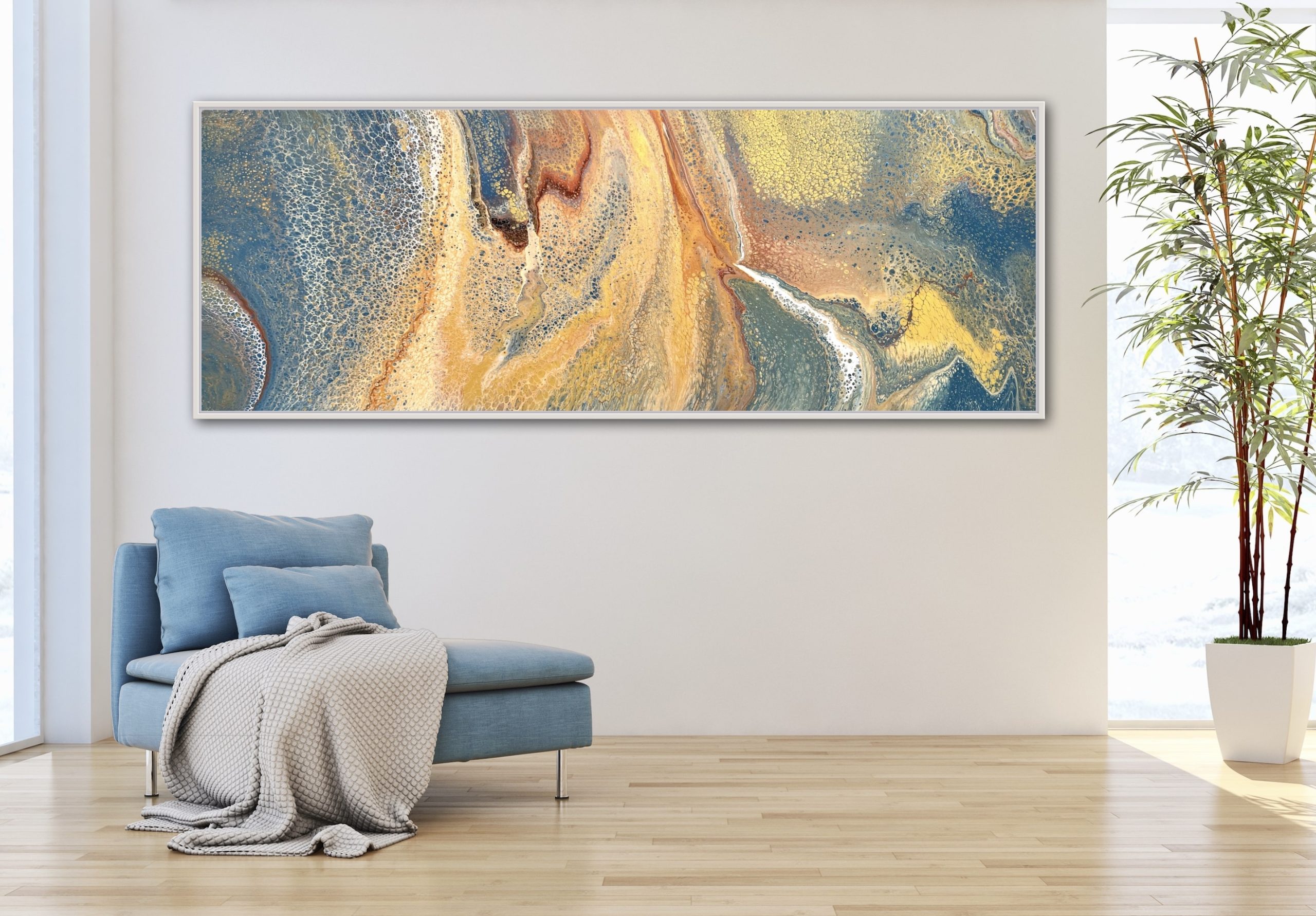 Summer Shores was created using various techniques combined to allow increased flow, interaction and separation of colours to create interesting patterns where pops of colour can be seen emerging from underneath. This added dimension adds lace and cells to the artwork creating an interesting and one of a kind painting that can never be replicated. A gorgeous variety acrylic pigments were used including metallic yellow & rose gold, bronze, copper, silver, cream, brown, grey, blues, black and white.