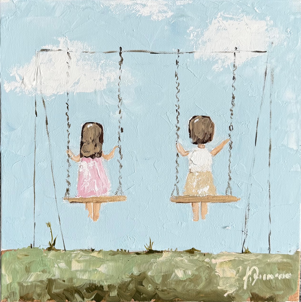 Summer Swing Set by Tanya Dhiacou – Original figurative artwork featuring 2 children on a swing set..