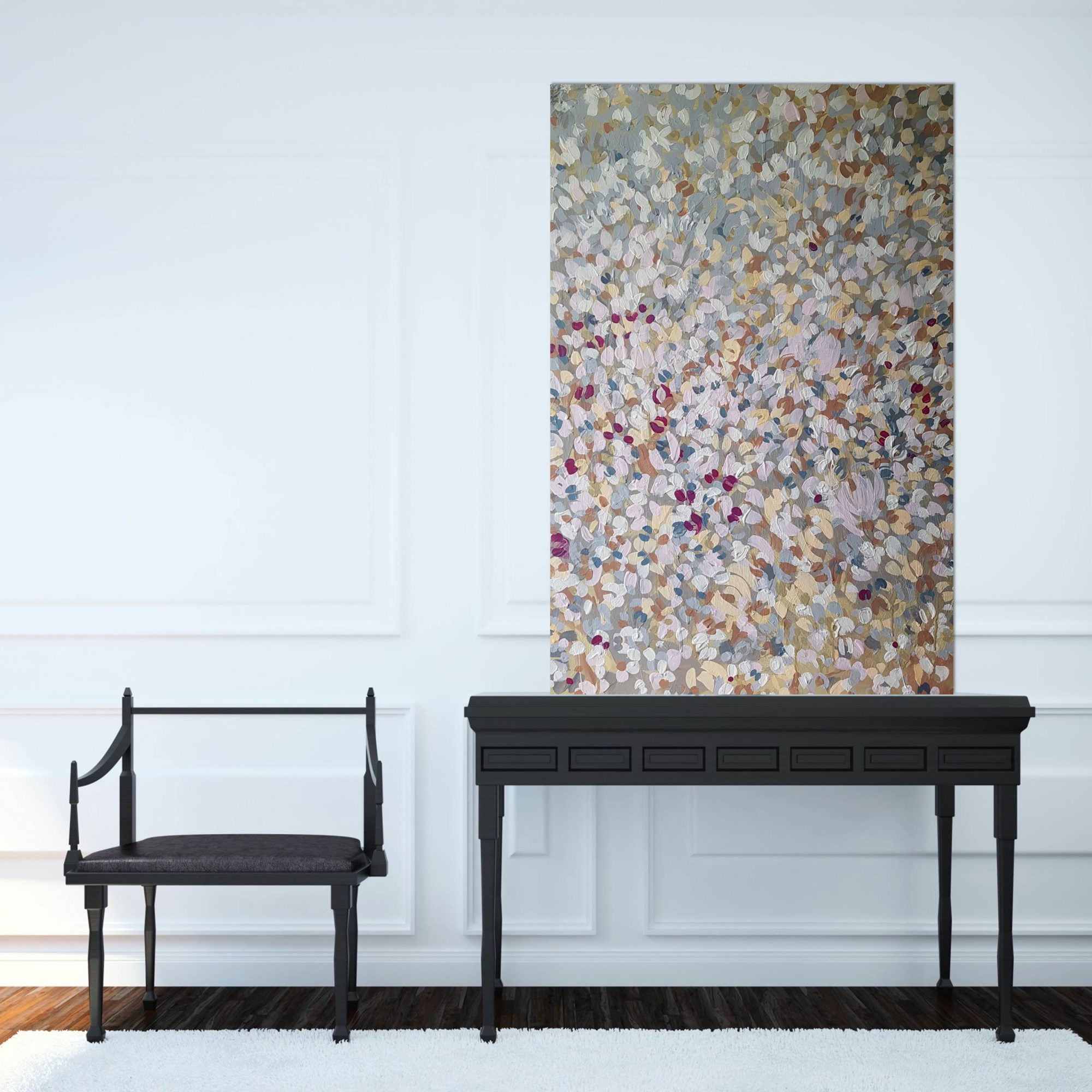 Pretty, rustic, expressive and decorative, this work would be at home in a variety of settings. It has an impressionist yet modern feel and holds an uplifting ambience in the room.