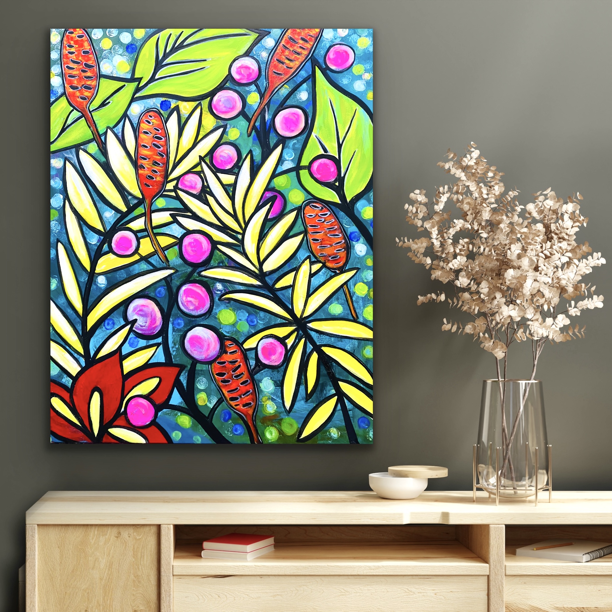 A modern, floral, abstracted acrylic painting to add life and vibrancy to a wall at home. Created spontaneously, free flowing tropical garden vibes just popping those colours, as nature does with my own reimagined shapes and balls of light.