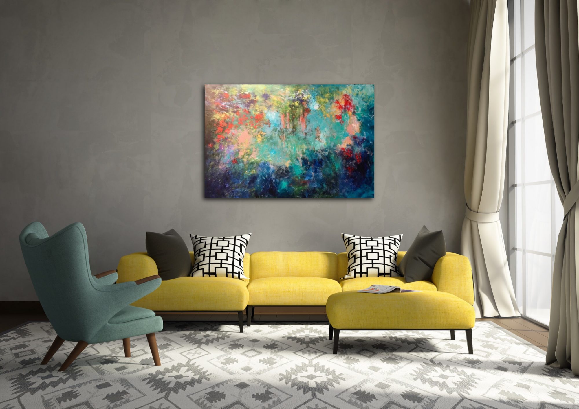 Summer’s Romance is a intuitive abstract expressionism where I allowed myself the freedom of large brushstrokes and pallet knife technique application to express a romantic scene.