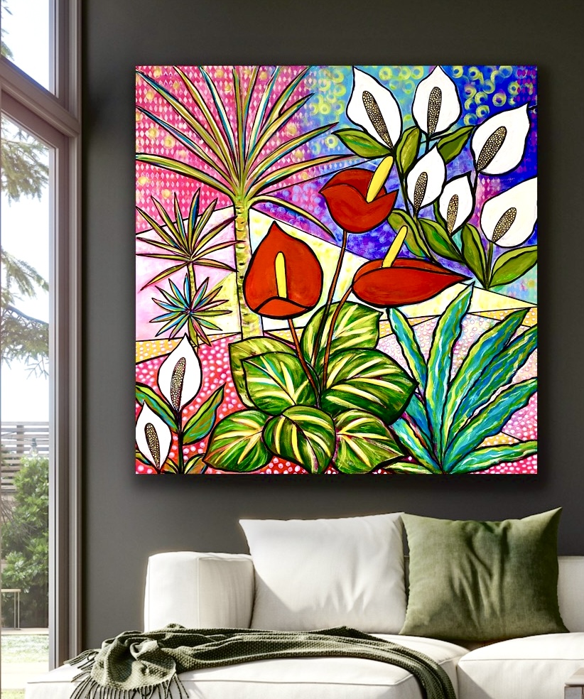 This is a floral artwork created just before the end of Summer 2023. My intention is always to paint and design artwork with a unique difference. This is a beautiful painting inspired by my own Brisbane garden, so the content is original, authentic, and inspired by tropical plants and flowers that thrive in the heat….. you can feel the warmth!