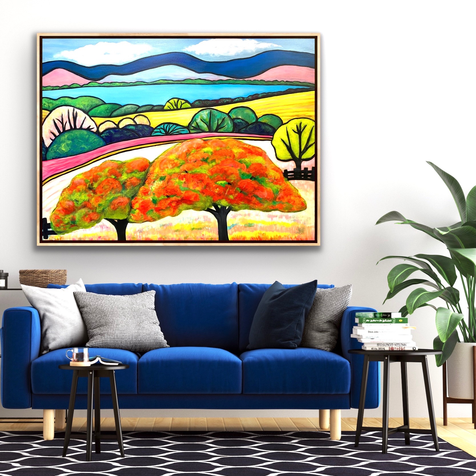 An original, modern, acrylic landscape painting, full of vibrancy and brush strokes. Inspired by poincianas in full flower in the countryside around Wivenhoe Dam, just outside of Brisbane. Long distant views to the dam and ranges beyond, gives a feeling of space and summer days, spent driving country roads and visiting home stays and farm stays, where the old world gardens always have at least one poinciana.