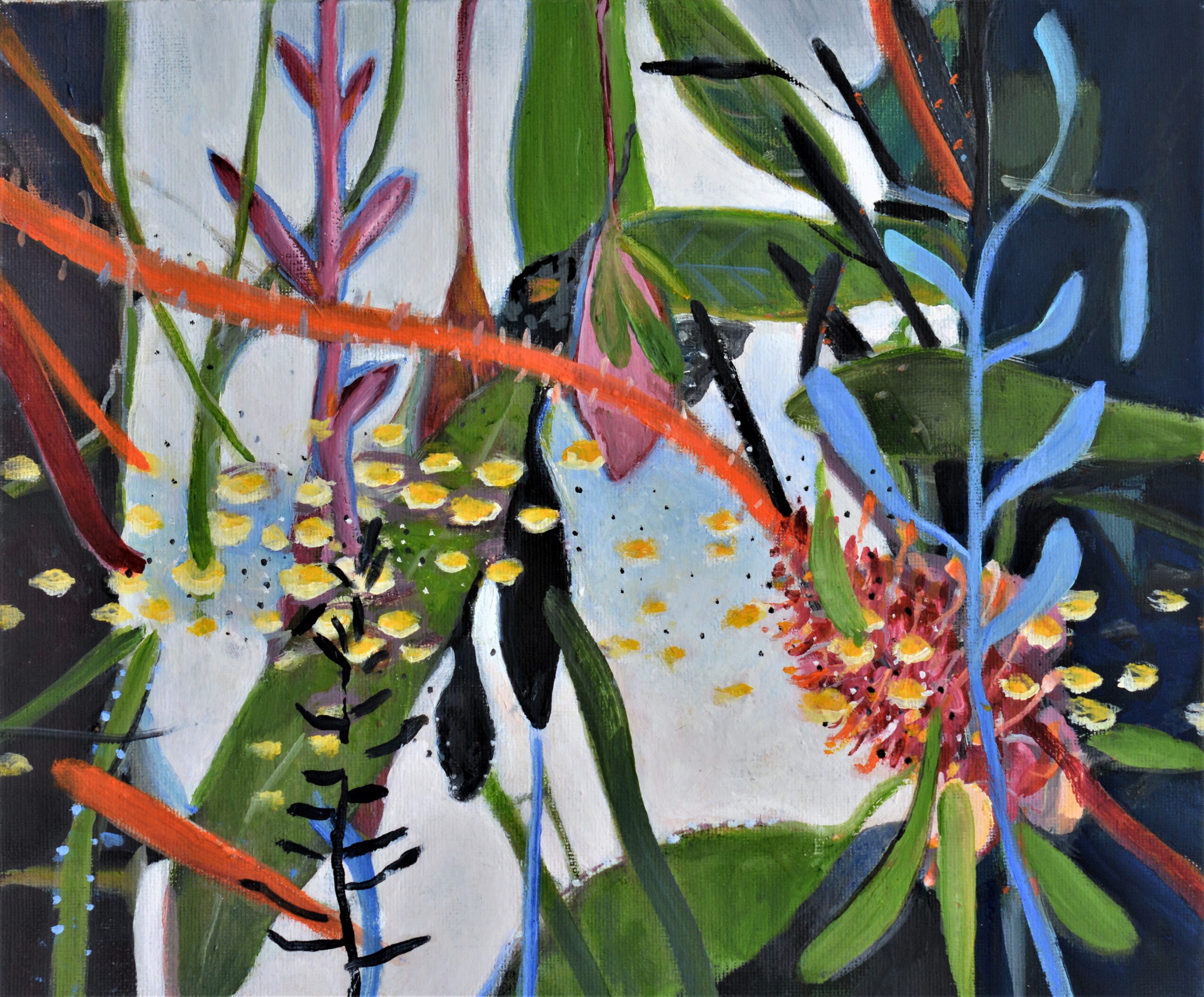 I love being immersed in nature and draw my inspiration from local creeks and streams. I work abstractly to interpret nature’s colours, rhythms and patterns.