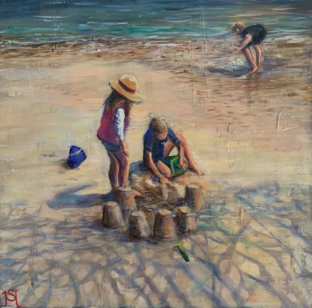 This small original painting is painted with acrylics on a textured square canvas. Children playing in the sand. This painting derived from a photograph which I took when we took our young grandchildren away for a few days to the sea.