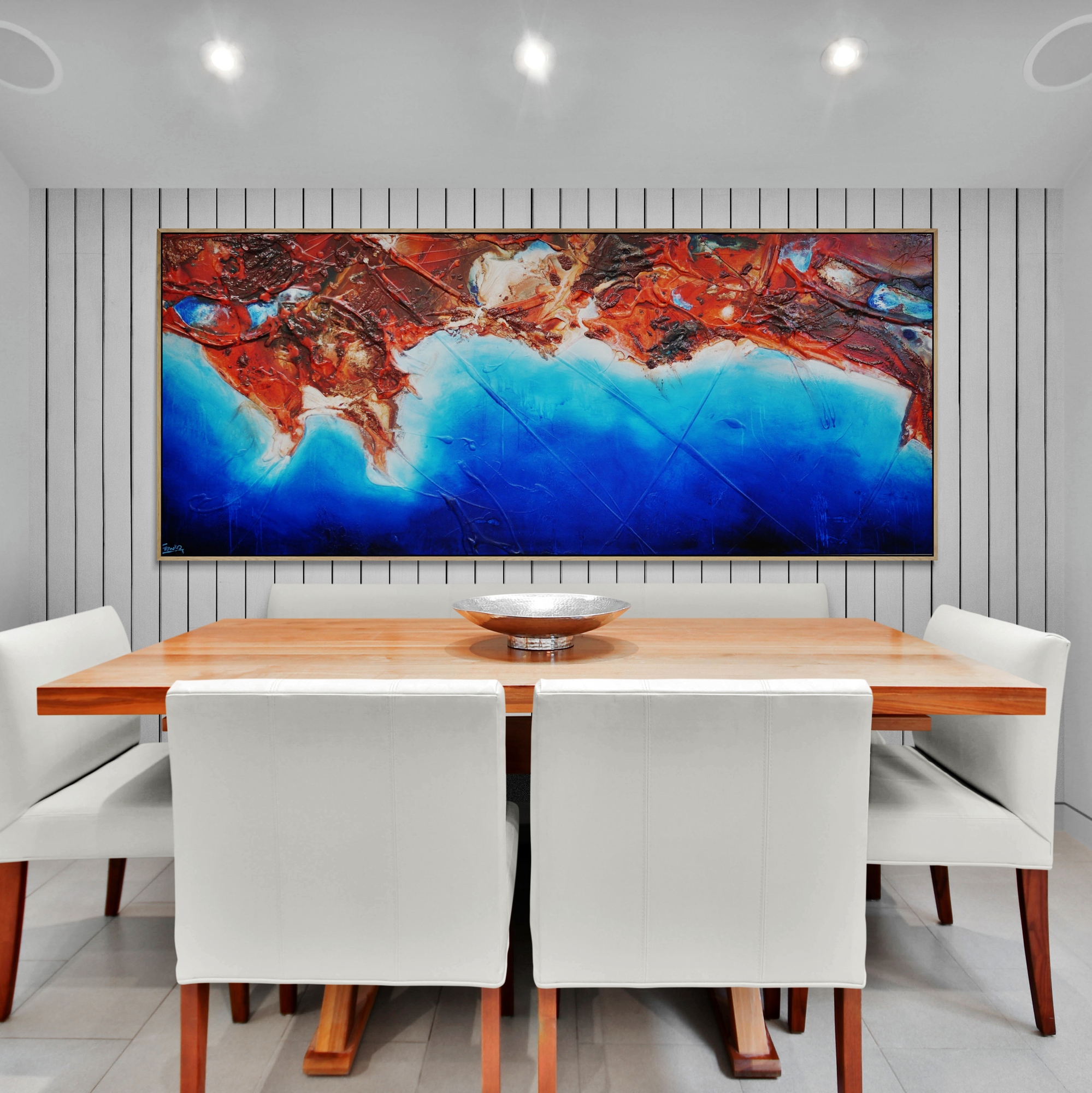 Provided with listings are some insitu images. We strive to ensure they are accurate in scale. Sometimes we will add an external frame to the painting insitu, to provide a vibe for how that would look also. As mentioned above, my pieces arrive ready to install with gallery finished edges and honestly, most people don’t add external framing. However, it is of course an option. If you have any questions, please let me know. We are here to help and want to make it as easy as possible for you if your décor aspirations require it.
