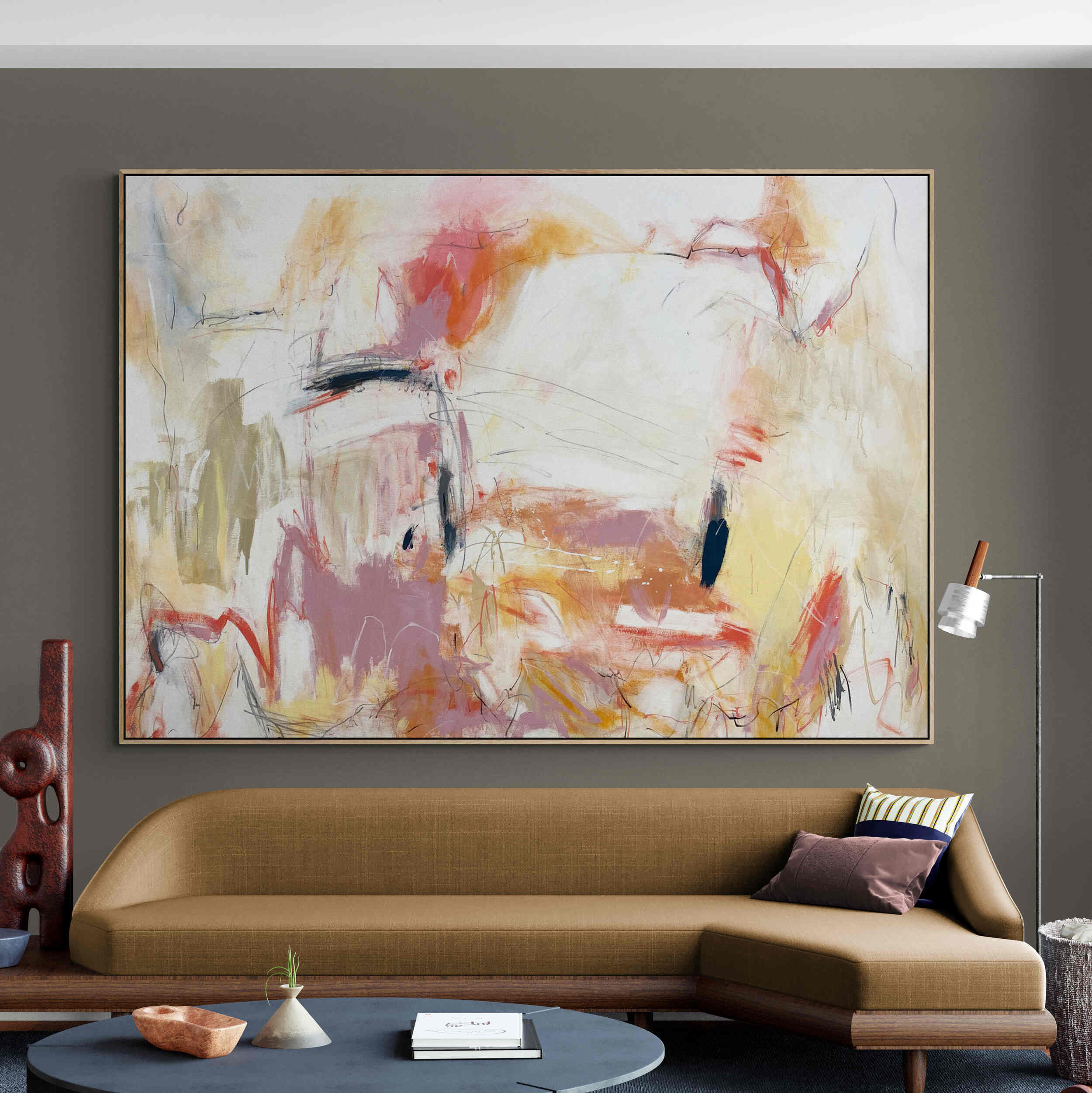 This large painting has areas of texture and a subtle palette of beige, white, black, peach, apricot, orange, sage, grey with bold rhythmic marks in paint and pencil across the canvas surface.