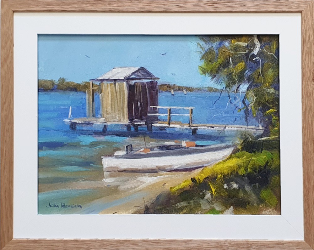 Sunday On The River – by John Pearson – it was a perfect spring afternoon as I set my easel up on the banks of a local river. An old fishing shack and boat helped set the scene which I really enjoyed painting.