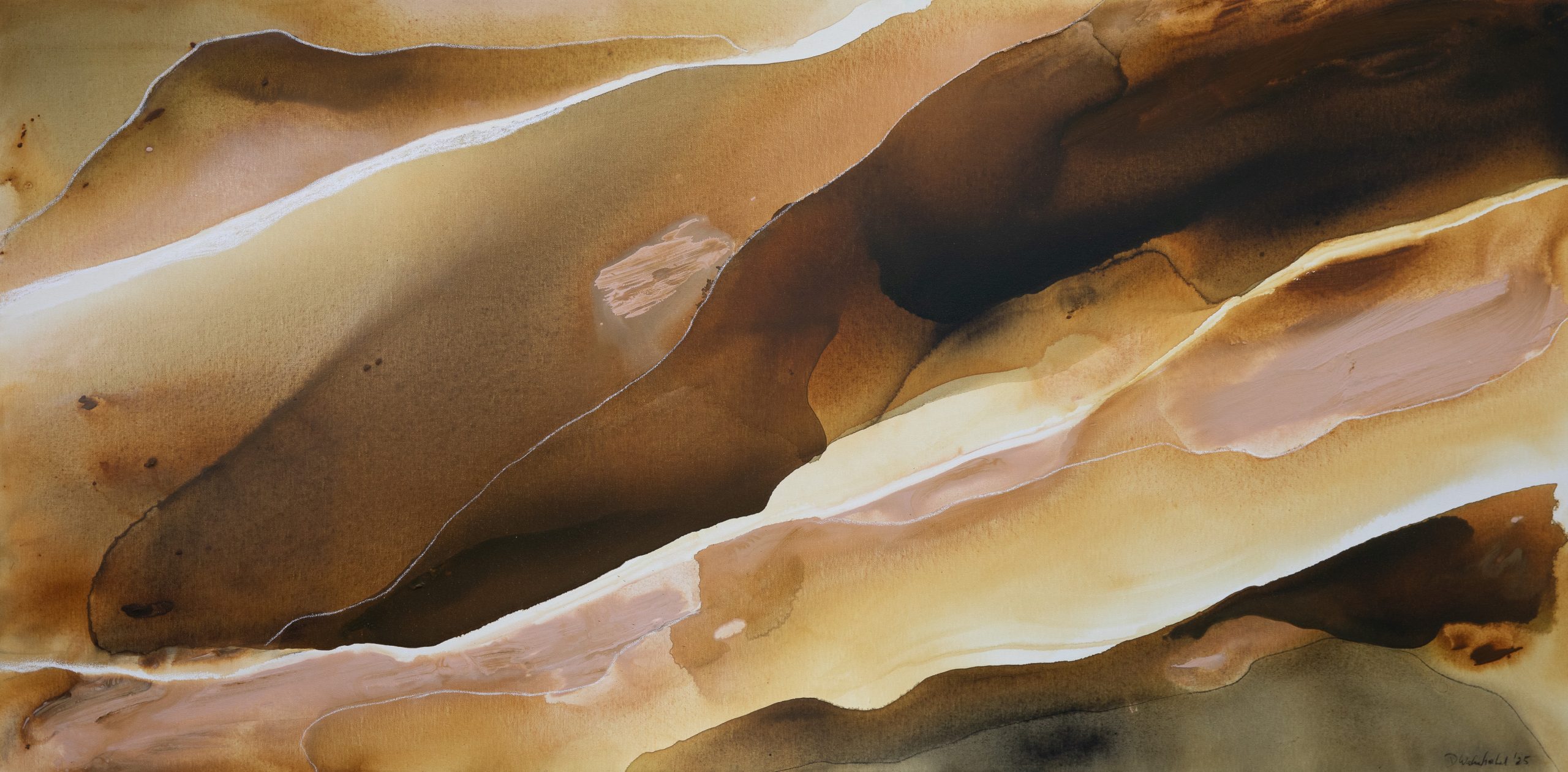 I have mixed a variety of desert colours for use in these paintings: ochres, terracotta’s, pinks, and browns, plus a selection of oxide, to create the effect of moving through this unique landscape.