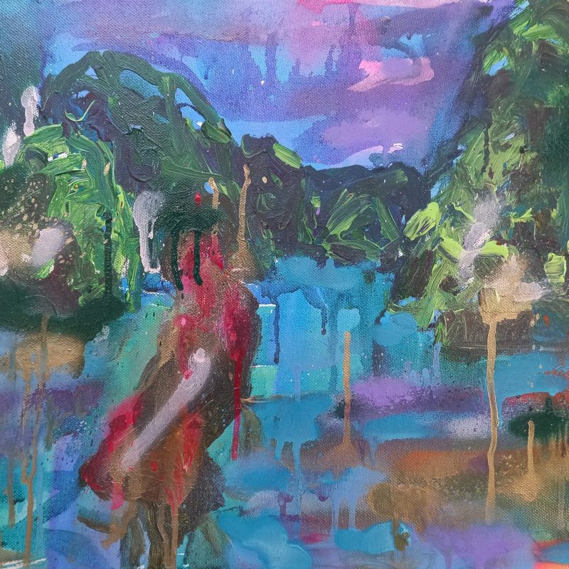 Sue has sealed the painting with matt medium varnish and signed it on the back.  The edges are painted black and it is wired and ready to hang.