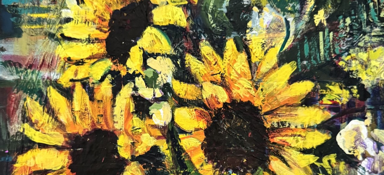 Sunflowers by Sue Hill.   Sue loves sunflowers and this little mixed media painting started with an abstracted background of geometric coloured shapes and forms made with gel medium and cut out paper bits glued to the canvas. Sue added patches of acrylic over this textured surface. She sealed it and allowed the painting to dry before painting an arrangement of flowers over the top. This allowed some colours to come through and breaks up hard lines.