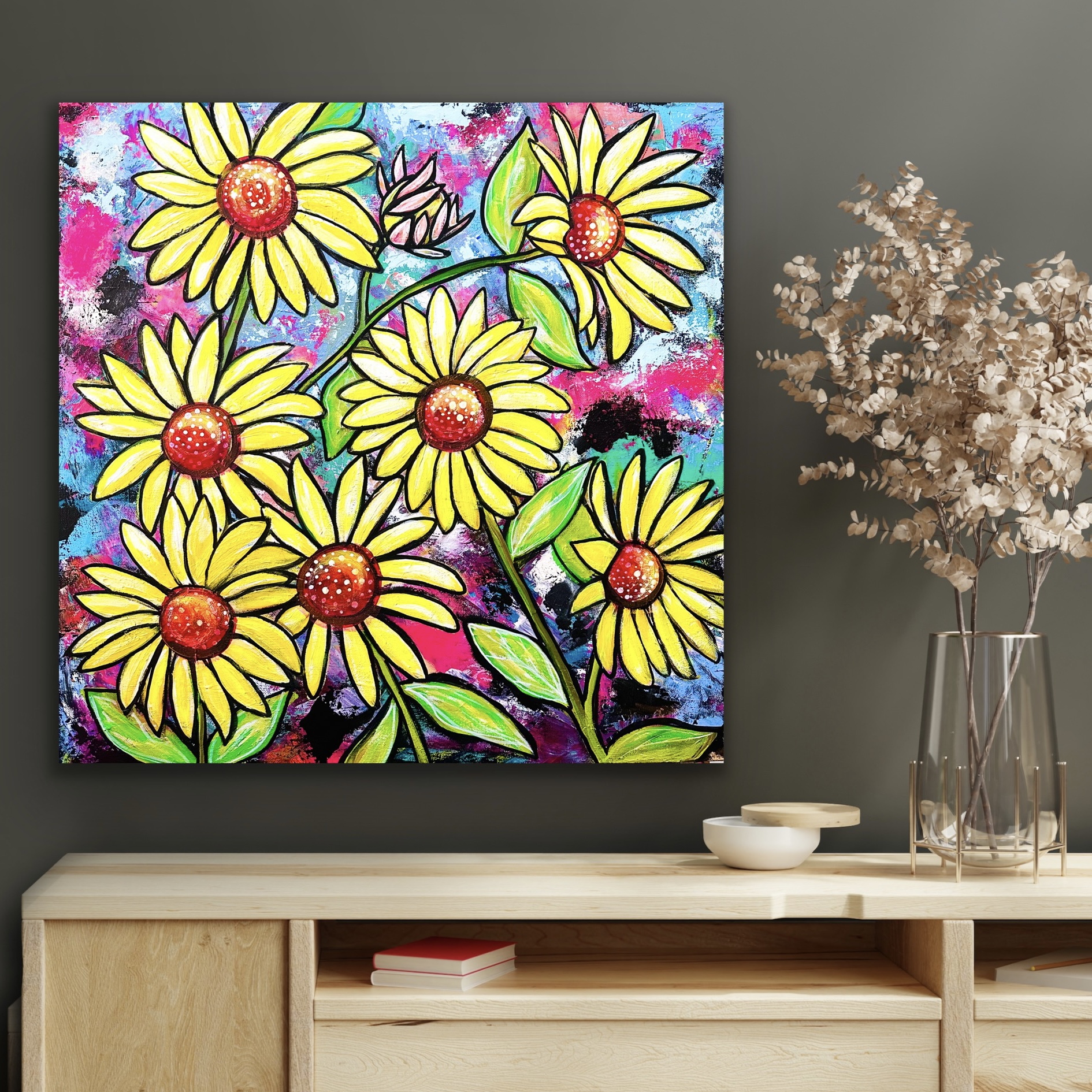 Especially painted for sunflower lovers to hang on a wall at home to brighten spaces with an original, one off artwork. No prints available.