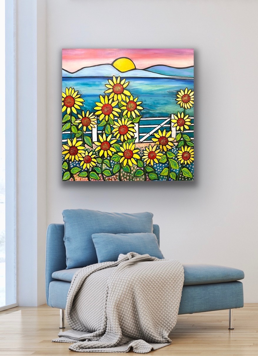 Summery sunflowers growing beside the sea on a high cliff top, with an outlook to the islands. Art to make you happy every day on a wall at home. Impressionistic, stylised and bright, textured and full of light and seascape blues. I know that you will like this one!
