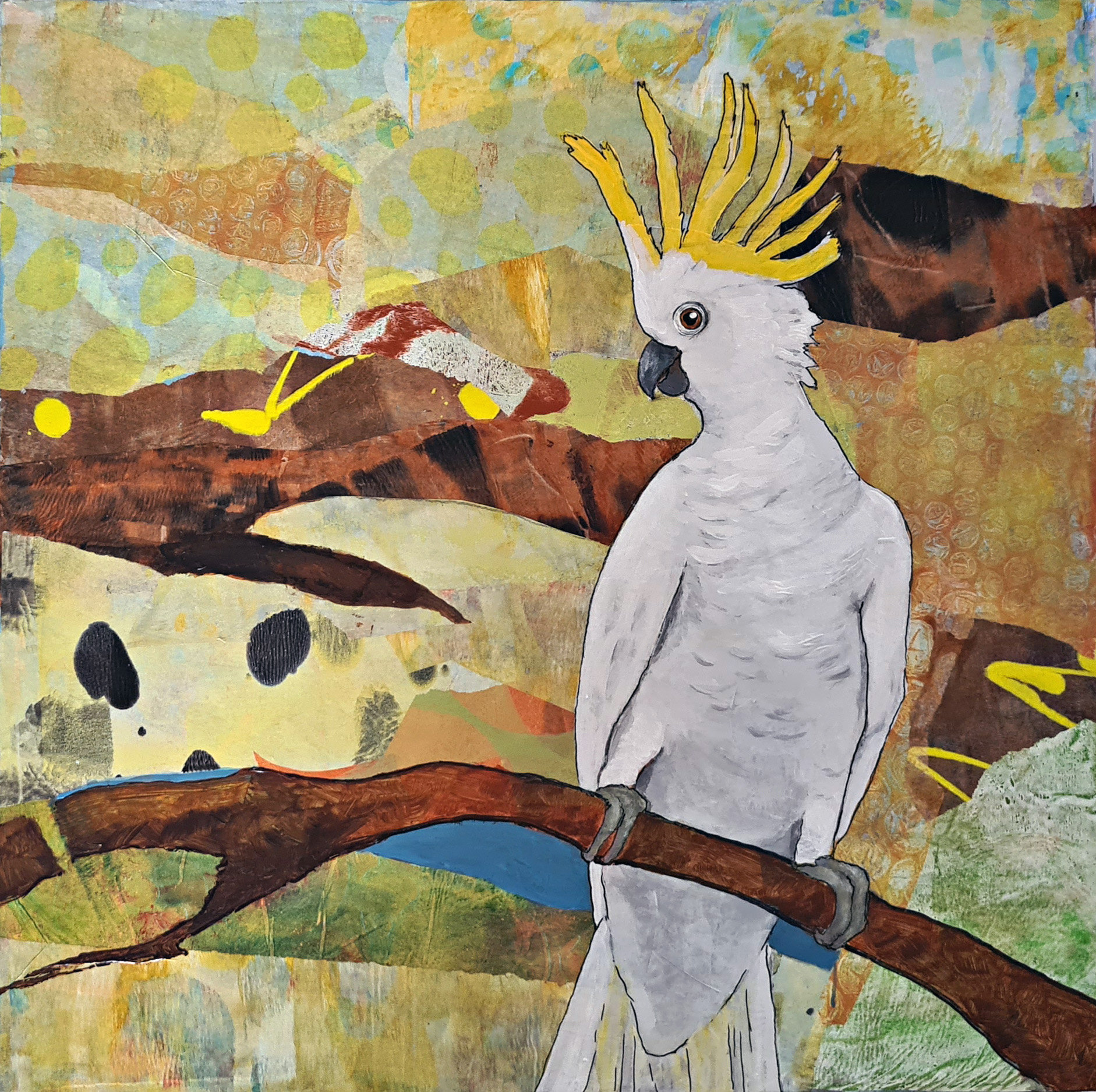 Susanne’s Cockatoo was created using acrylic paint and the beautiful sunlit background was created with acrylic paint, collage paper and mixed media.