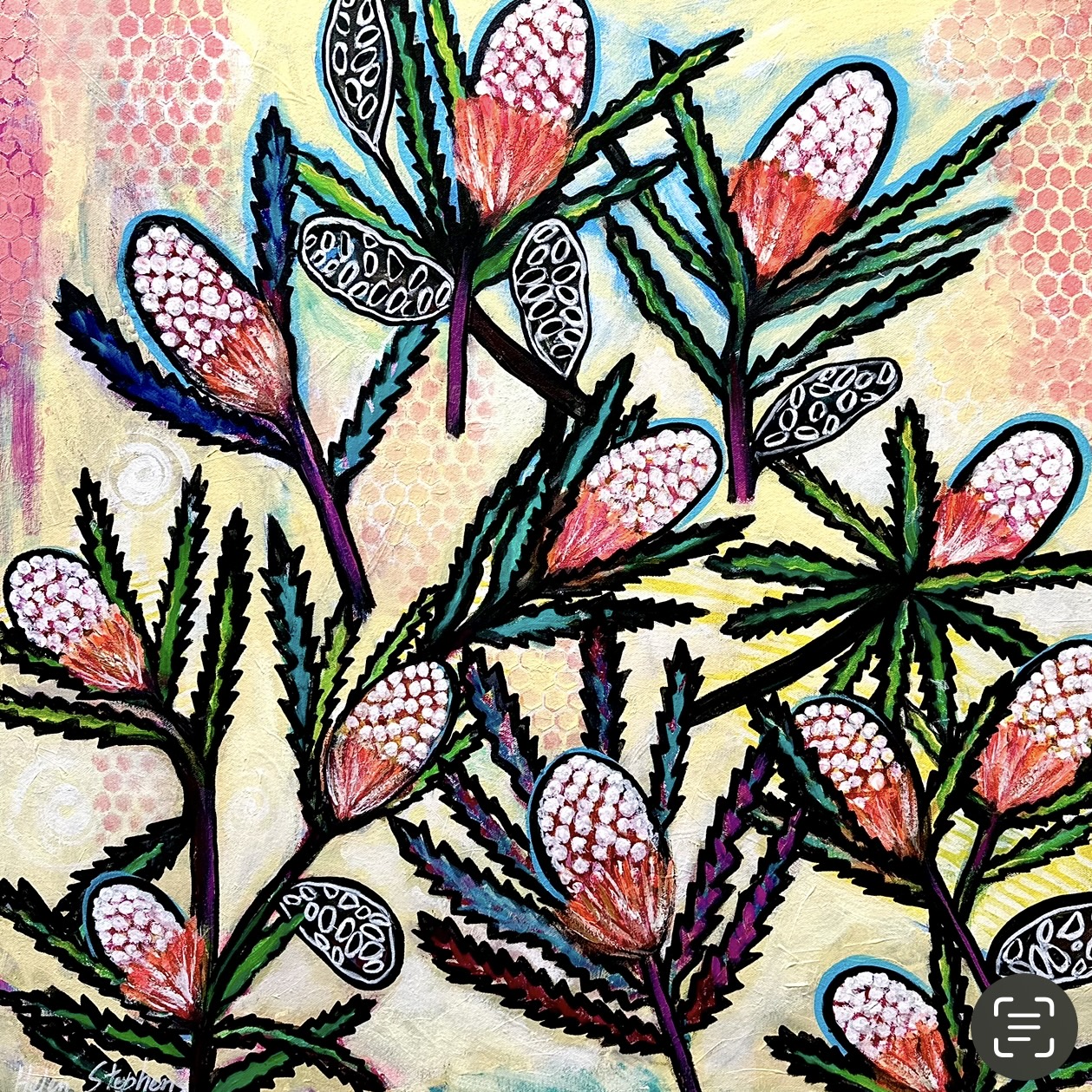 A reimagined , whimsical painting of native Australian banksia to hang on bedroom walls, over a small buffet or anywhere that you know it will sing.