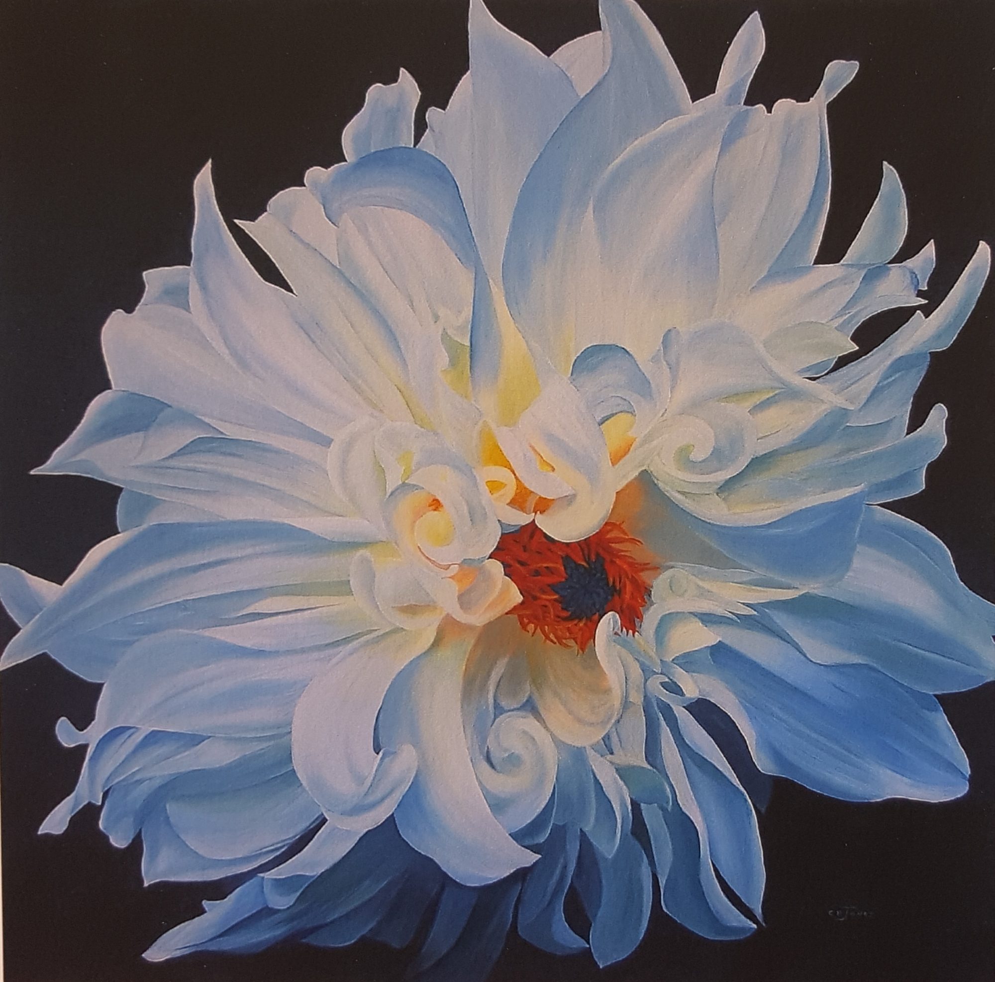 This beautiful Giclée is a Fine Art Reproduction on a quality canvas measuring 60cm x 60cm.  The original oil painting won first prize in the Open Section of the Lions Art for Leukaemia. These beautiful dahlias are a magnificent size and the sun was shining through the petals when I took my reference photograph. I just had to paint it. The giclée is an affordable way of owning a prize winning painting. It looks just as beautiful as the original and would look lovely anywhere in the home.