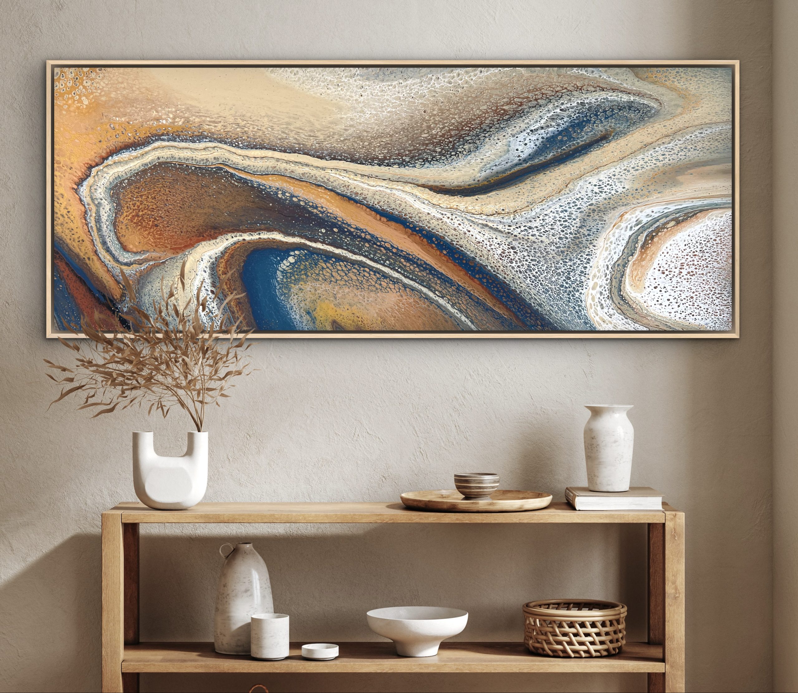 Warm earthy tones are woven with metallic gold, copper, and bronze that shift with the light, while deep blue and grey accents add contrast and depth. Fine details of lace and organic cells emerge across the surface, drawing the viewer in for a closer look. This dynamic statement piece is truly one of a kind and can never be replicated.