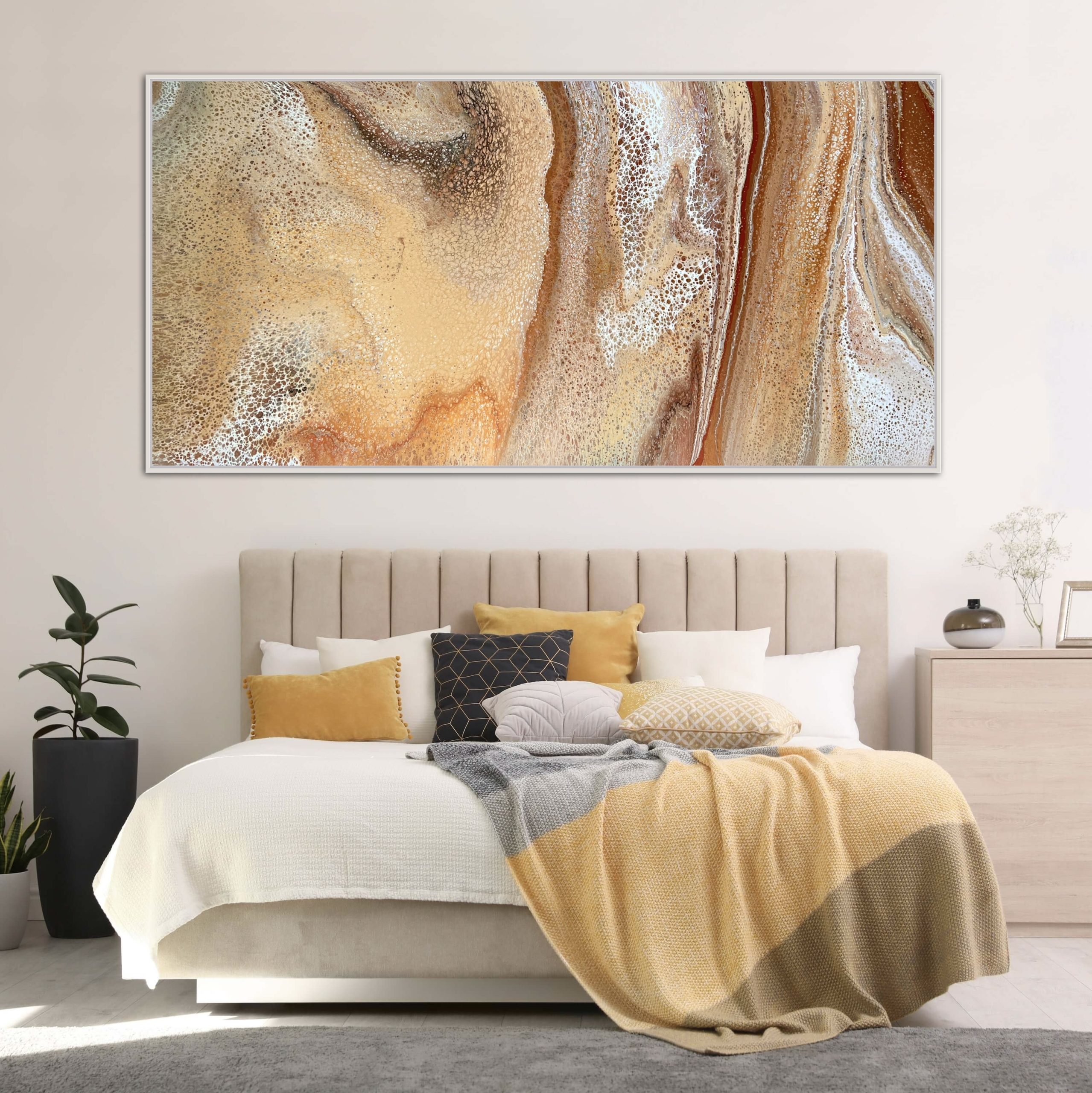 ‘In situ’ photos have been included to help with visualisation of the artwork in your home. In situ photos provided were created using the ArtStage app and may not be perfectly to scale. This being said, every effort has been made to represent the size of the art accurately but please read the dimensions of the artwork to ensure it fits your space perfectly. Where provided, photos of framed art are for illustrative purposes only.