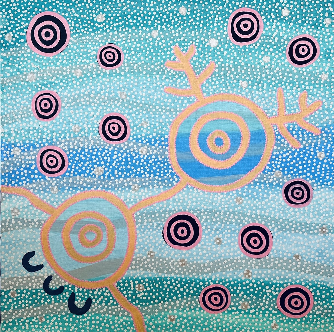 Enter the radiant realm of ‘Sunlit Serenity’ by Jacob Sarra, an Indigenous artwork that beautifully captures the tranquil harmony of a father swimming with his two young daughters amidst the summer heat. Bathed in the warmth of the sun, this evocative piece immortalizes the shared joy, laughter, and serenity found in the simple yet profound moments of familial connection.