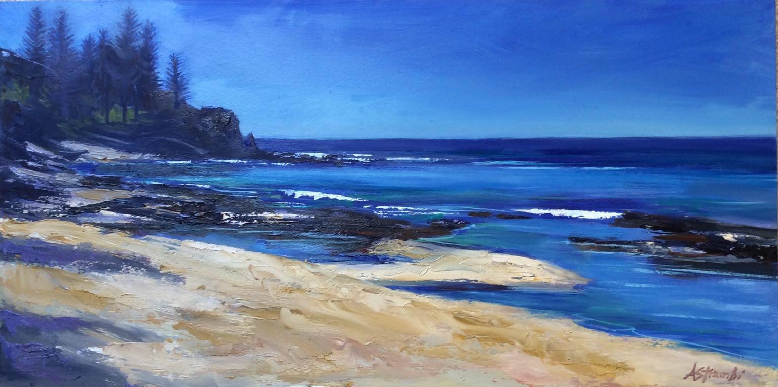 Sunny Coast Memory by Anne Strambi – This original oil painting is inspired by visits to the Sunshine Coast in Queensland. This particular spot is at Kings Beach, Caloundra, with the pine trees on the headland and rocky shallows. I have painted this seascape in a loose impressionist style using both brushes and a palette knife. The painting is painted in oil paints and is unframed so that you can choose your own frame to suit your home. Note, this painting is unframed.